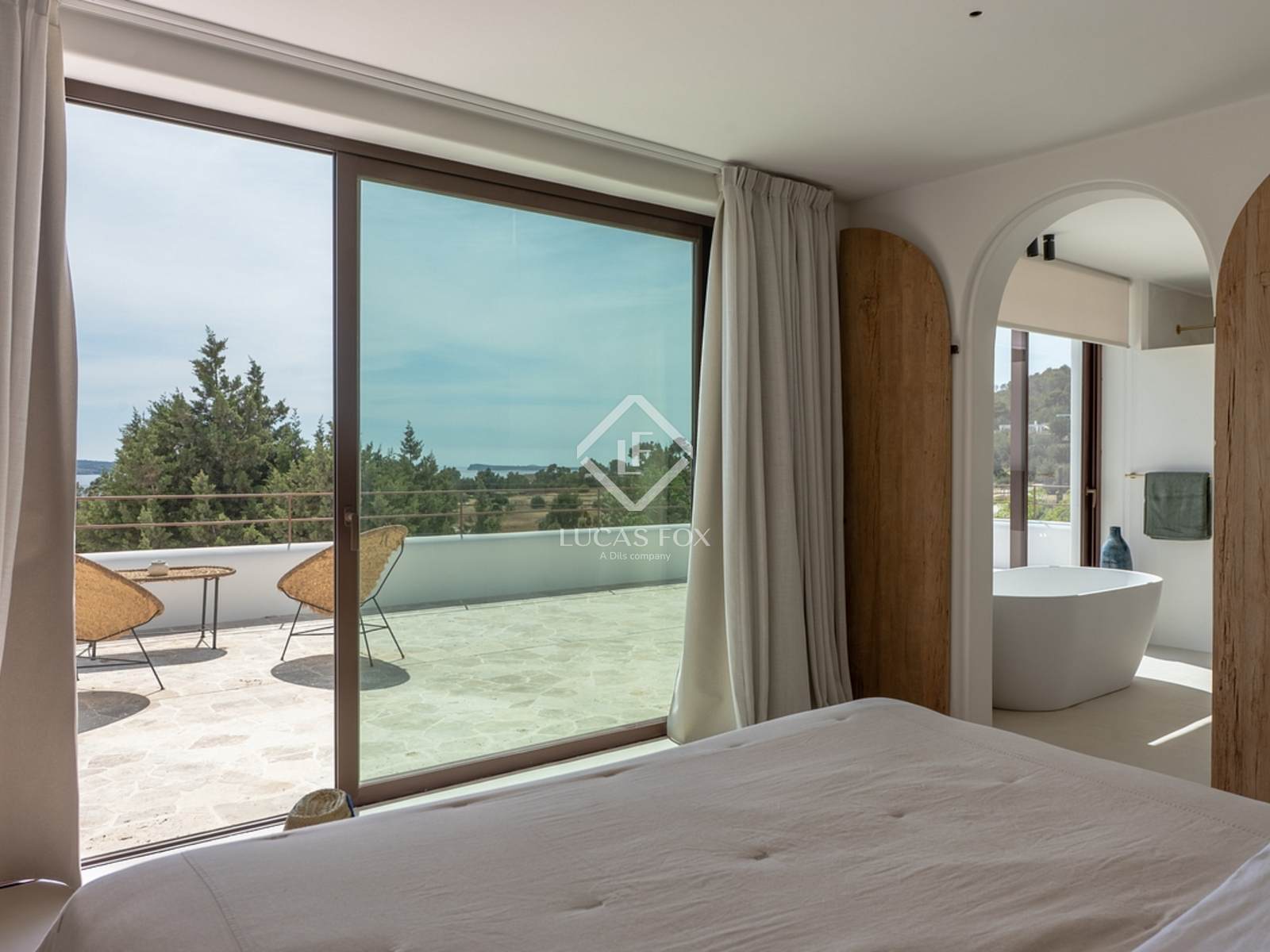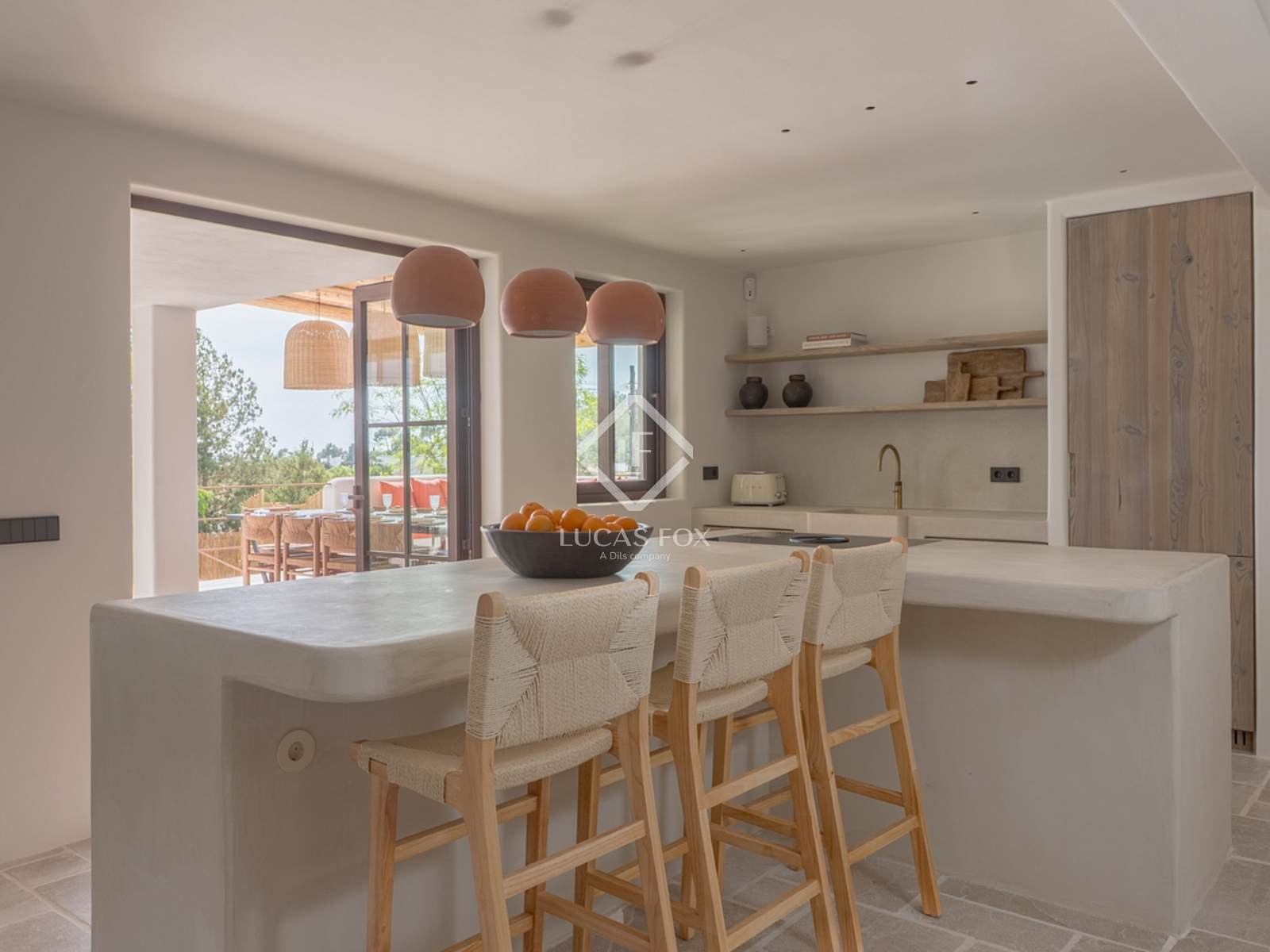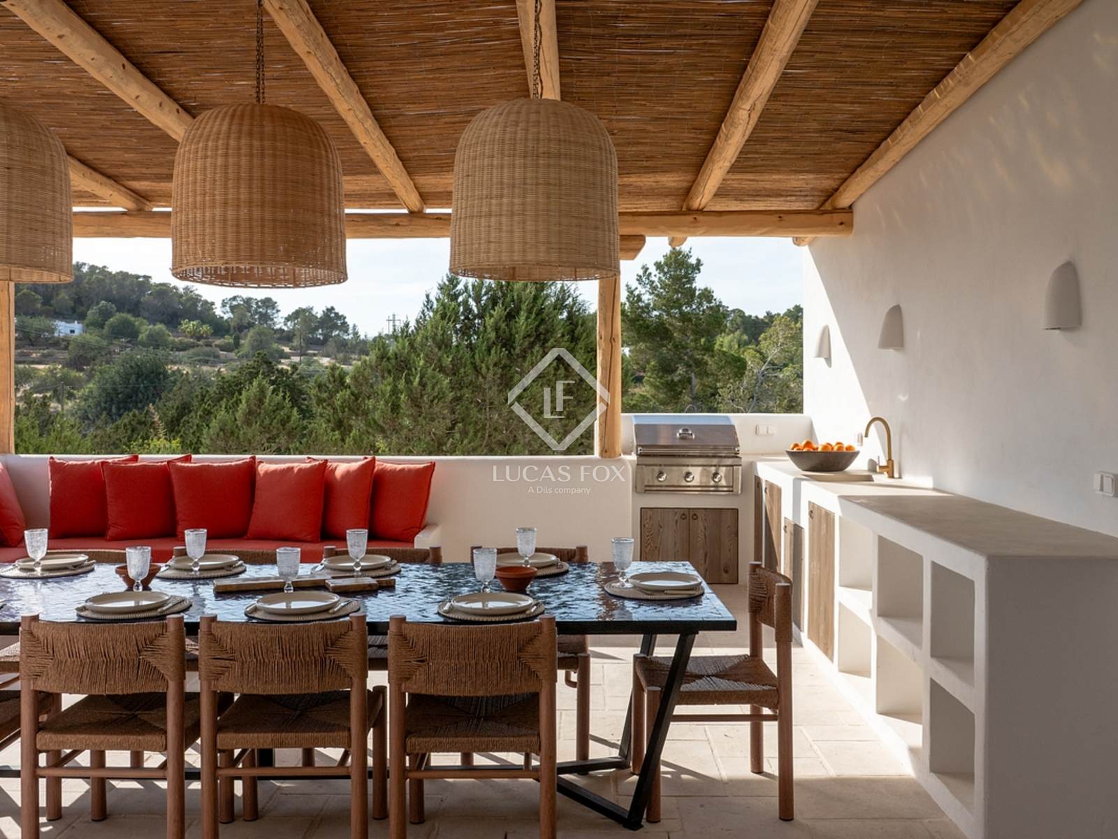 Situada em um terreno privativo de 2.200 m², a vila oferece 330 m² de espaço interno e ostenta vistas panorâmicas espetaculares do mar, da paisagem ao redor e dos famosos pores do sol de Ibiza.