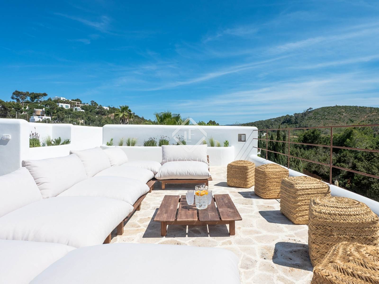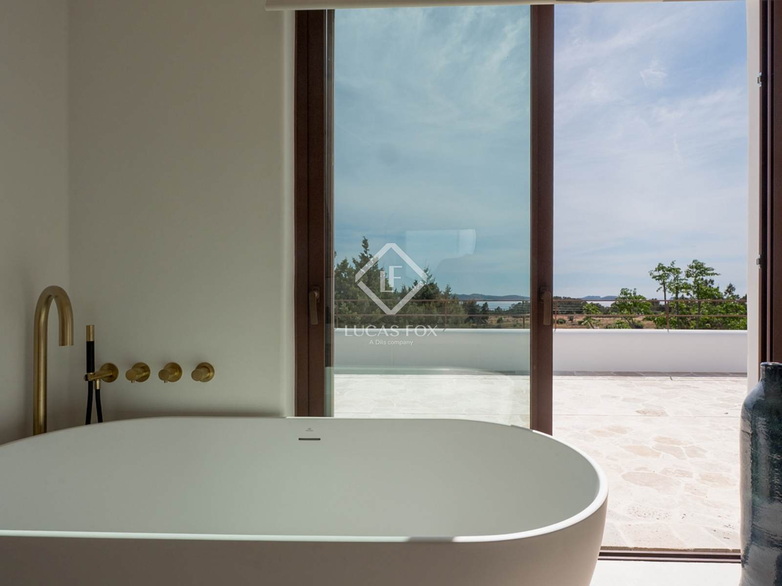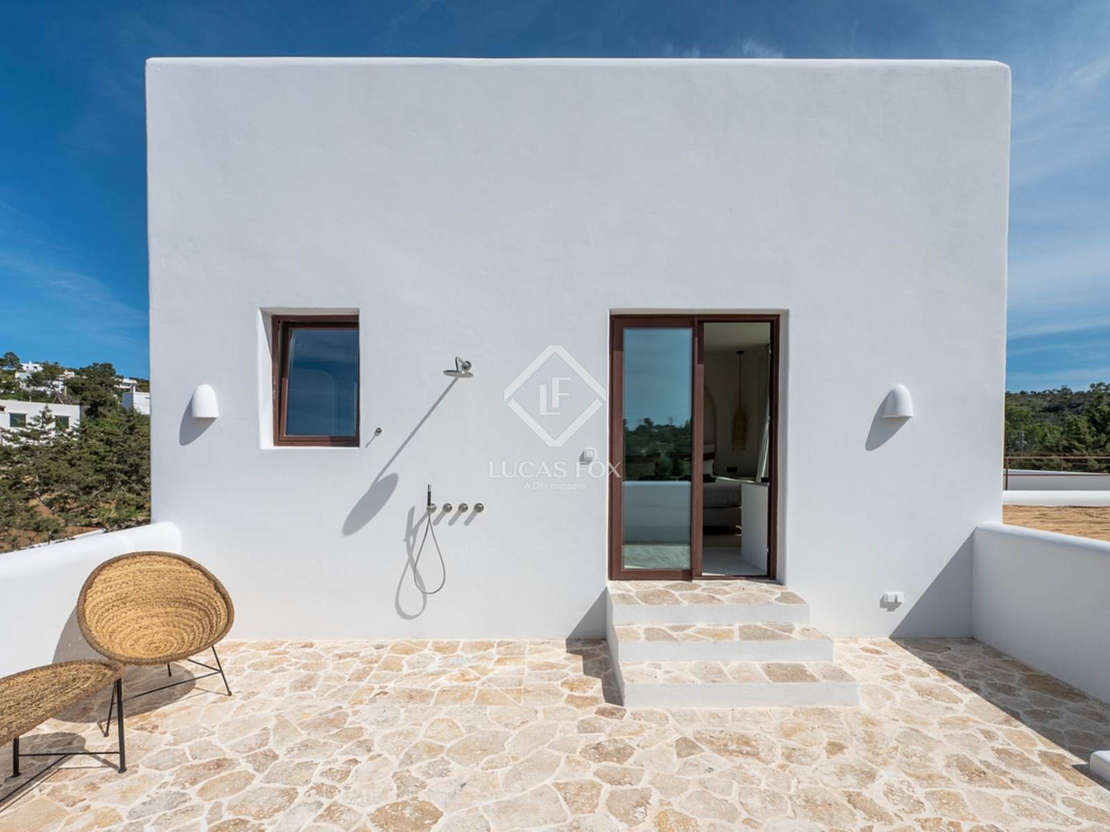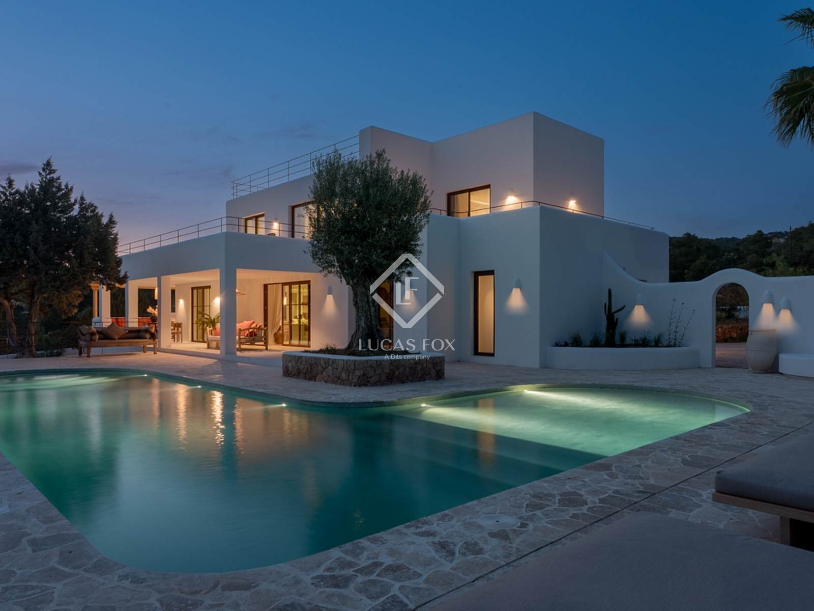 Situada em um terreno privativo de 2.200 m², a vila oferece 330 m² de espaço interno e ostenta vistas panorâmicas espetaculares do mar, da paisagem ao redor e dos famosos pores do sol de Ibiza.