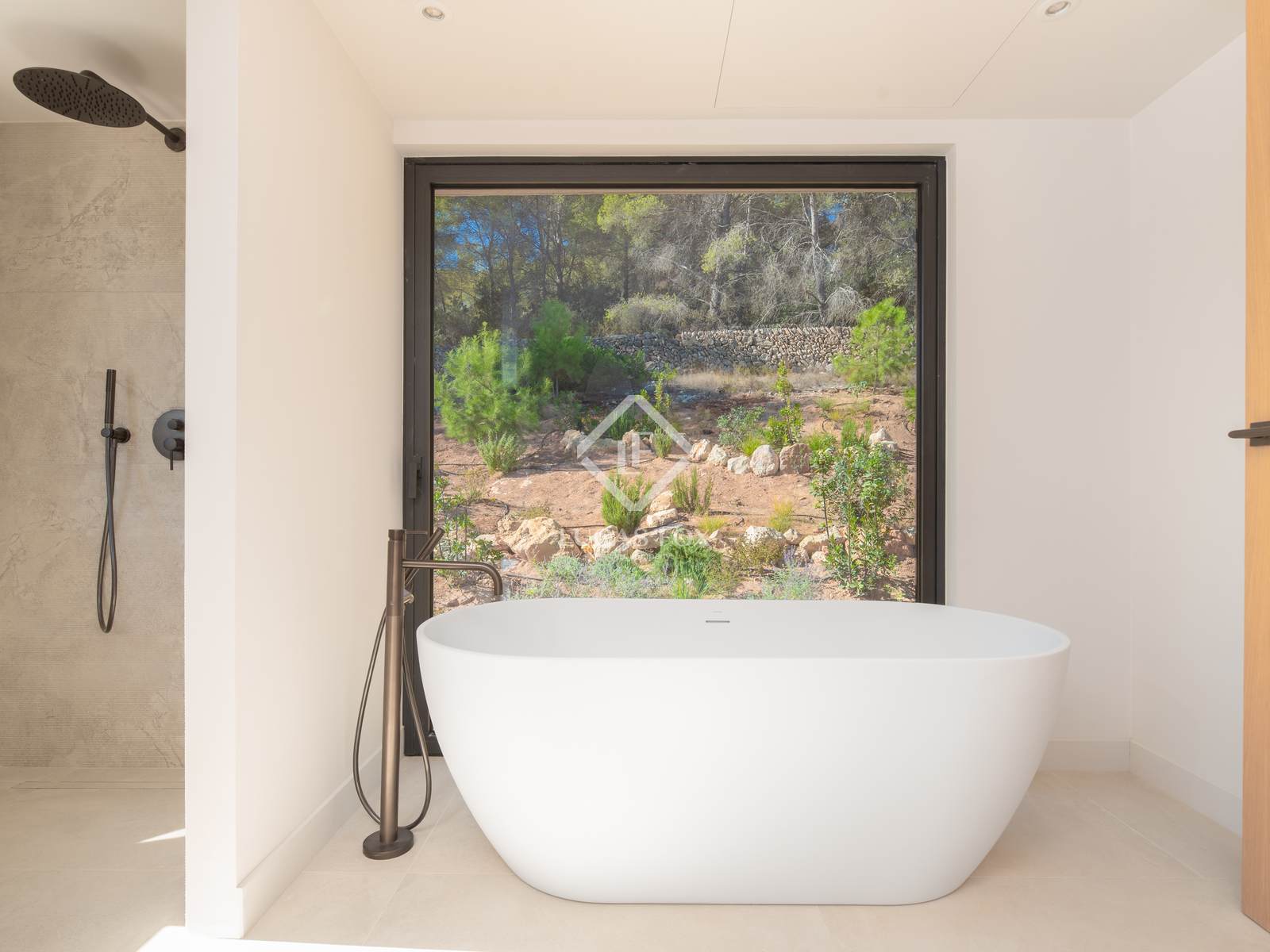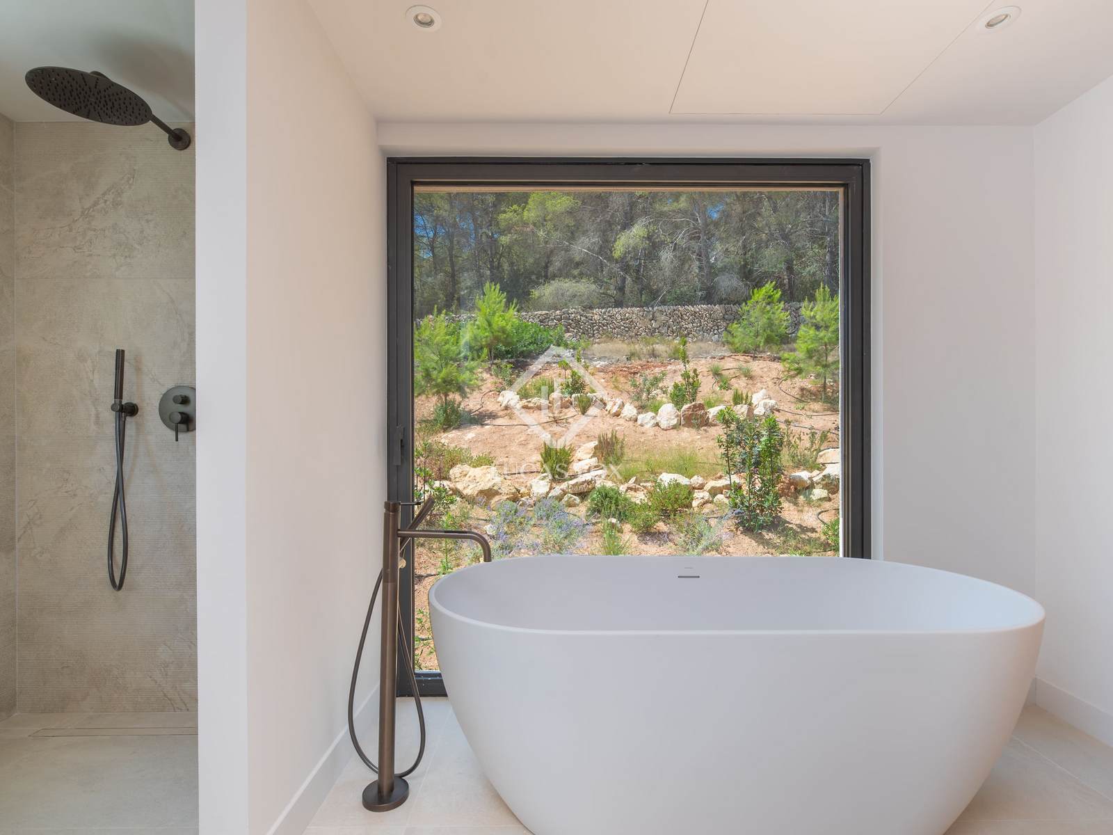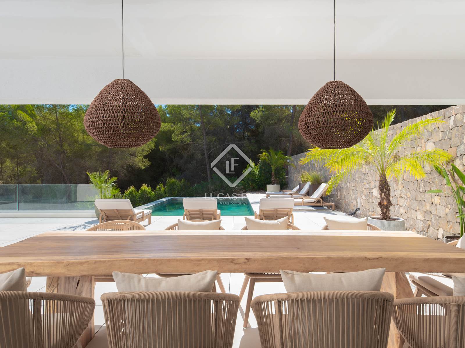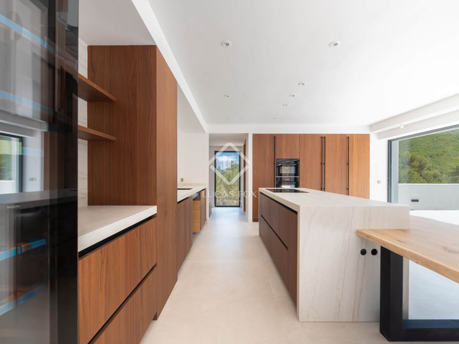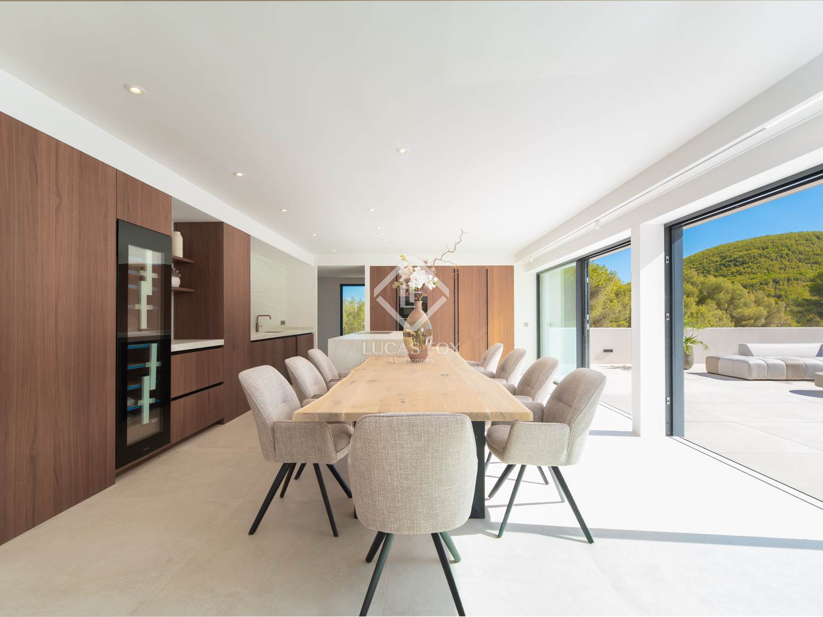 A vila apresenta espaços de estar abertos e iluminados, com grandes janelas do chão ao teto que inundam os interiores com luz natural e oferecem vistas panorâmicas da paisagem exuberante de Ibiza. A sala de estar e jantar em plano aberto se conecta perfeitamente a uma cozinha de designer totalmente equipada, criando um ambiente perfeito para entretenimento.