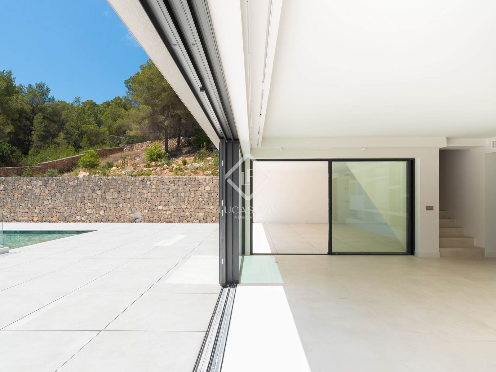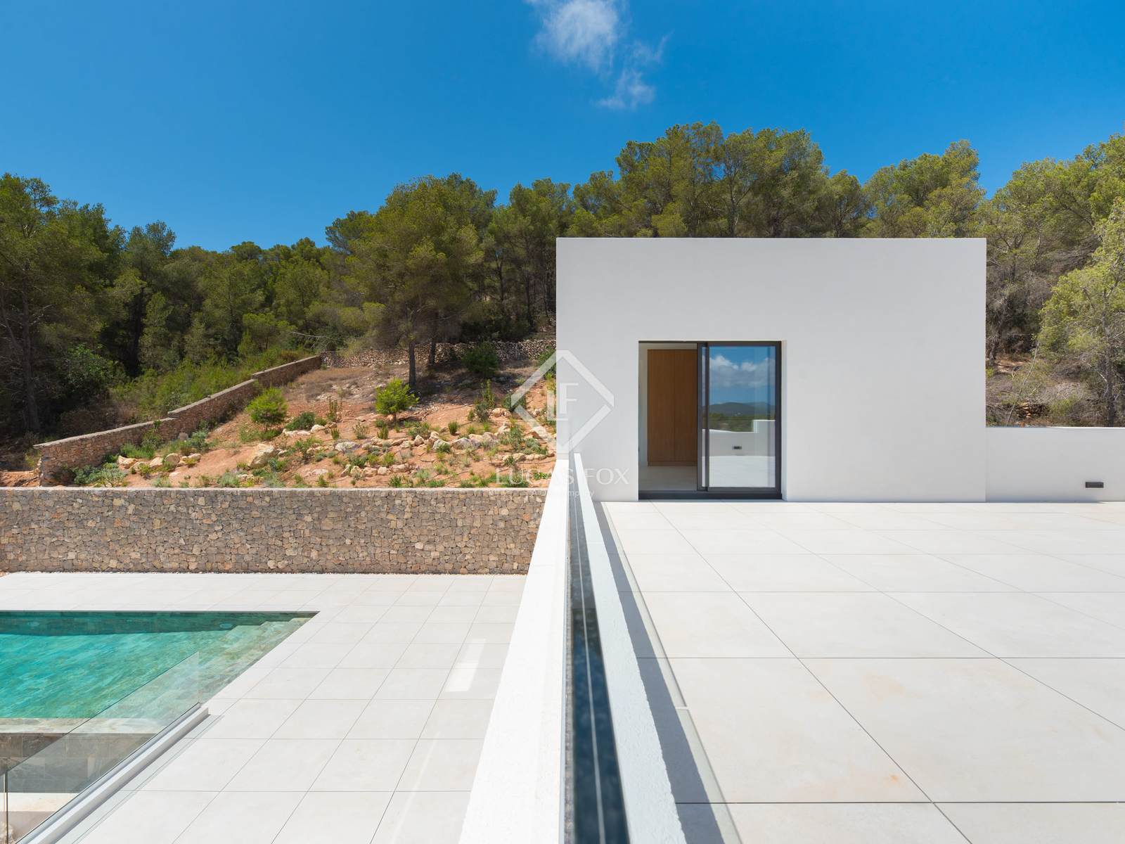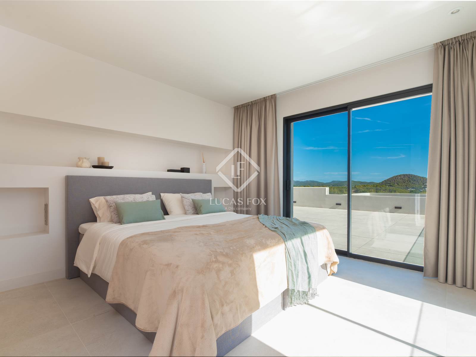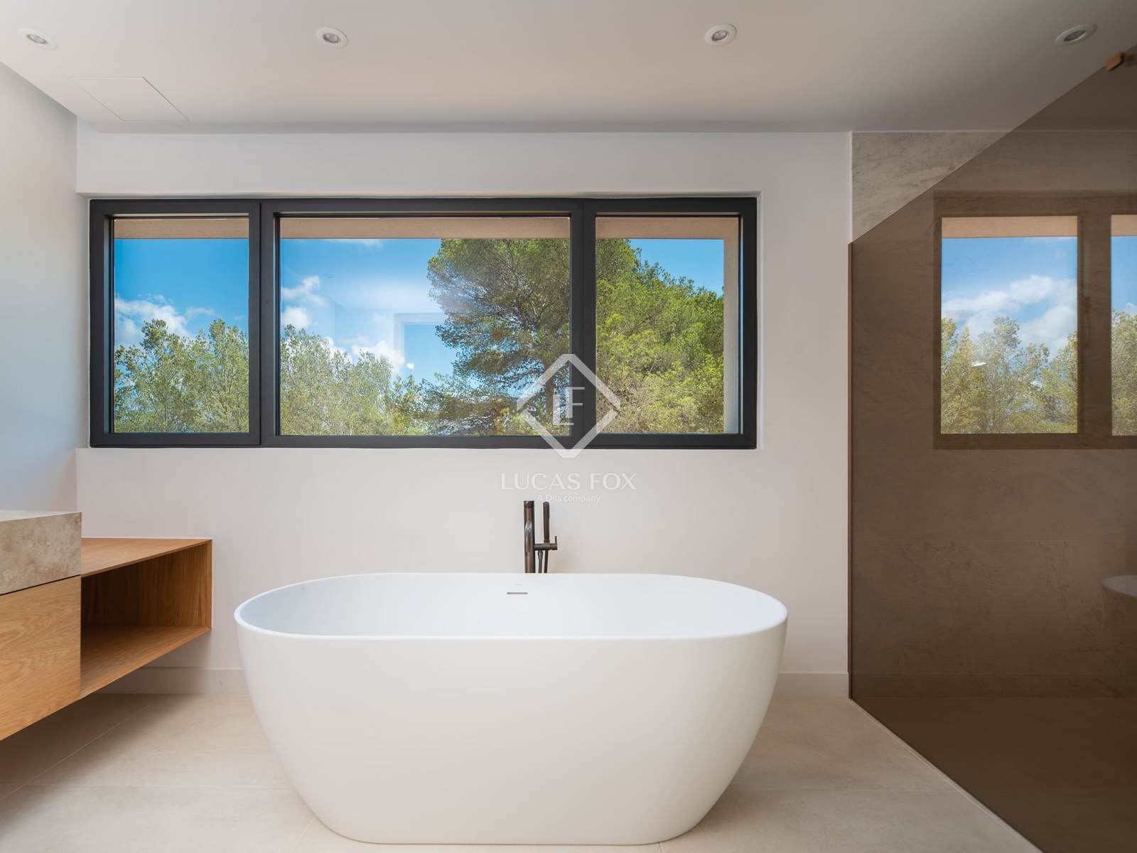 A vila apresenta espaços de estar abertos e iluminados, com grandes janelas do chão ao teto que inundam os interiores com luz natural e oferecem vistas panorâmicas da paisagem exuberante de Ibiza. A sala de estar e jantar em plano aberto se conecta perfeitamente a uma cozinha de designer totalmente equipada, criando um ambiente perfeito para entretenimento.
