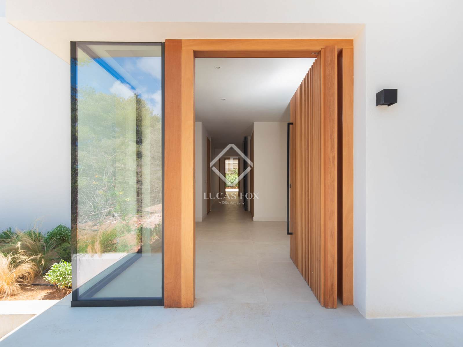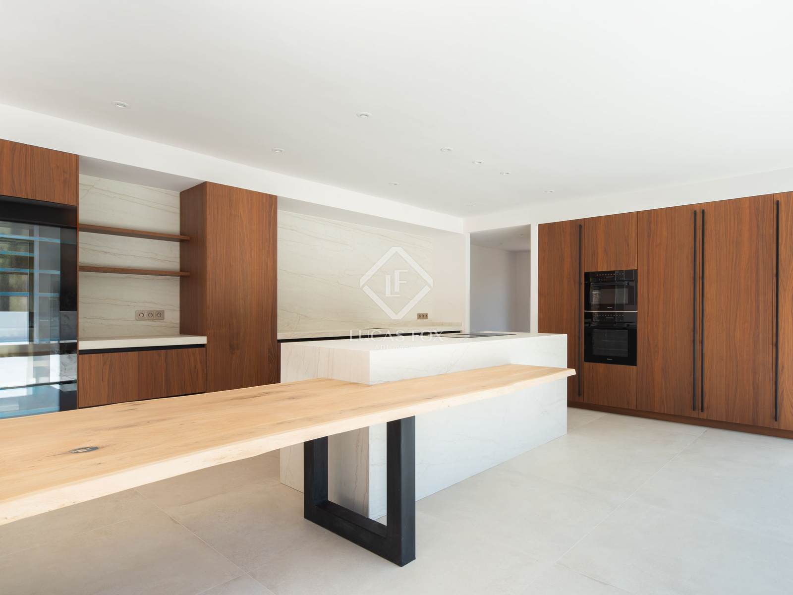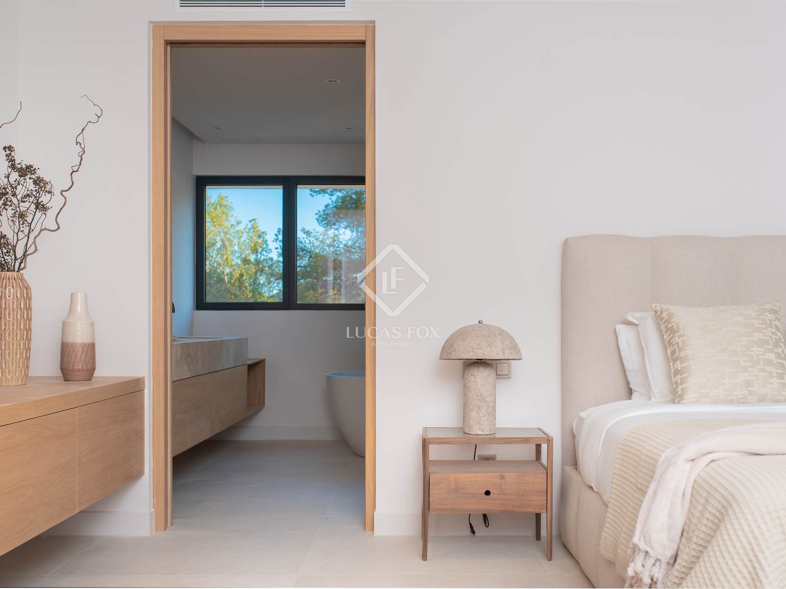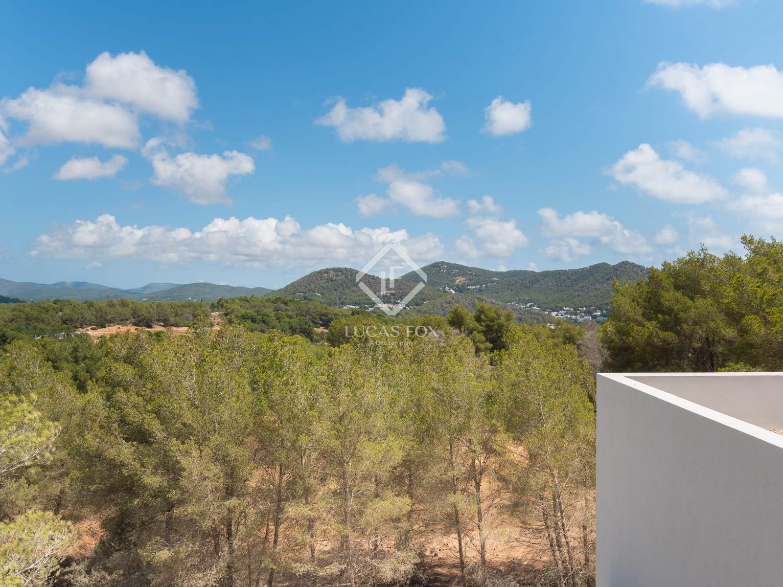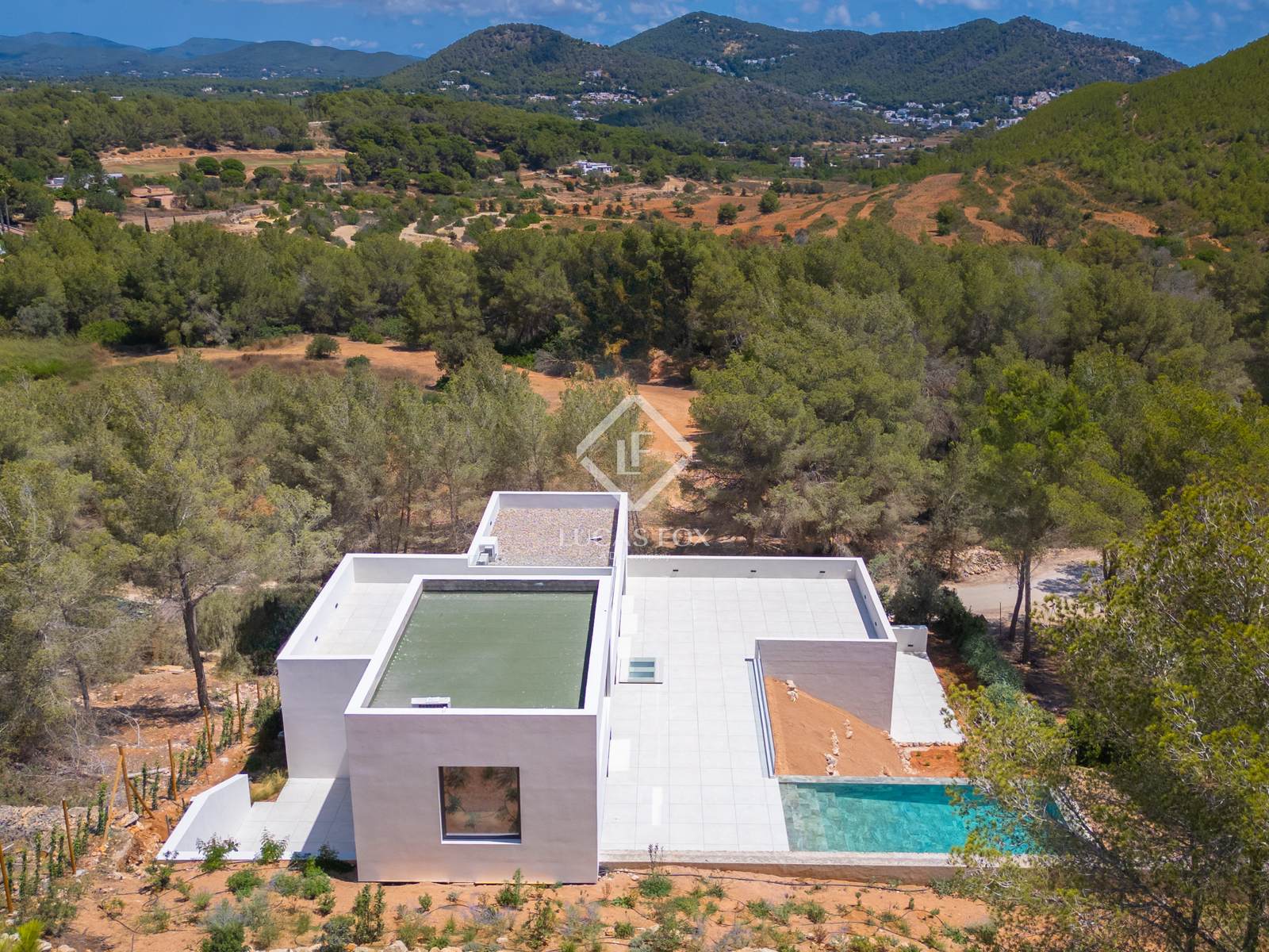 A vila apresenta espaços de estar abertos e iluminados, com grandes janelas do chão ao teto que inundam os interiores com luz natural e oferecem vistas panorâmicas da paisagem exuberante de Ibiza. A sala de estar e jantar em plano aberto se conecta perfeitamente a uma cozinha de designer totalmente equipada, criando um ambiente perfeito para entretenimento.