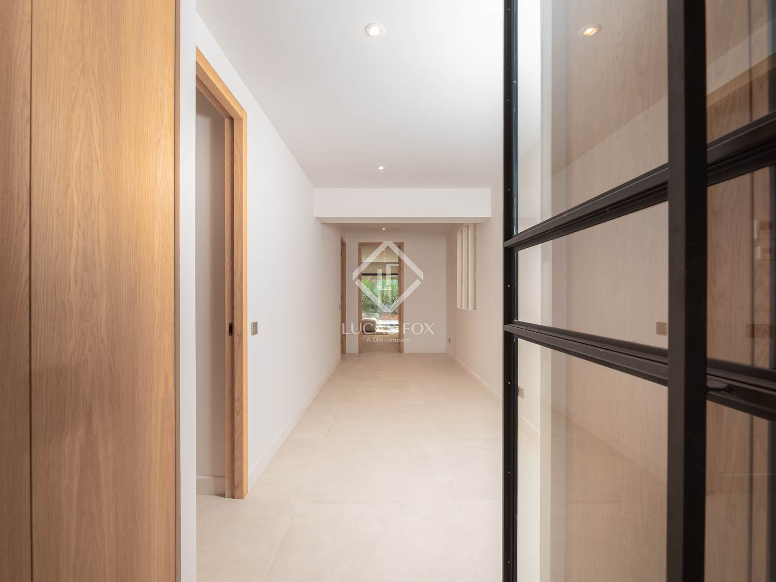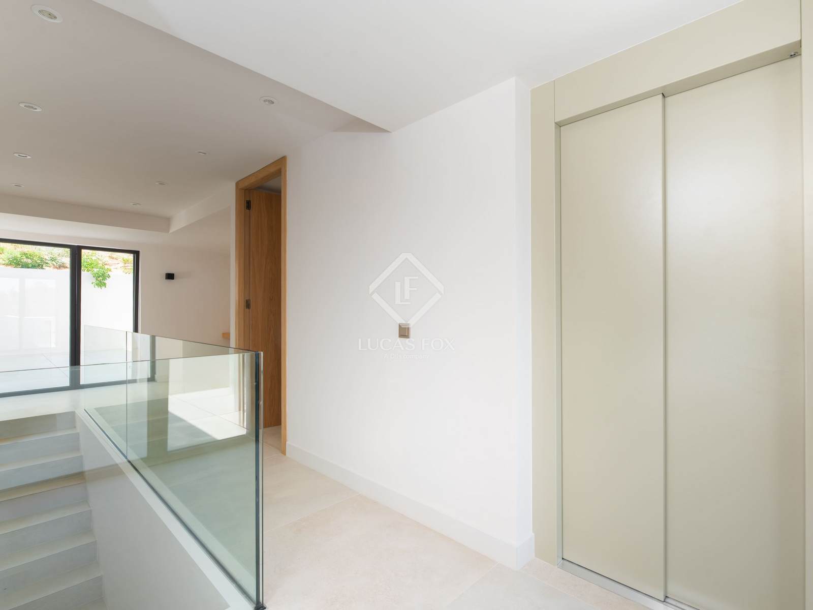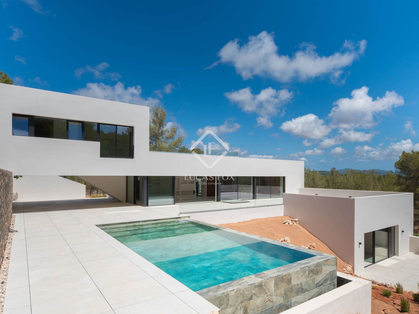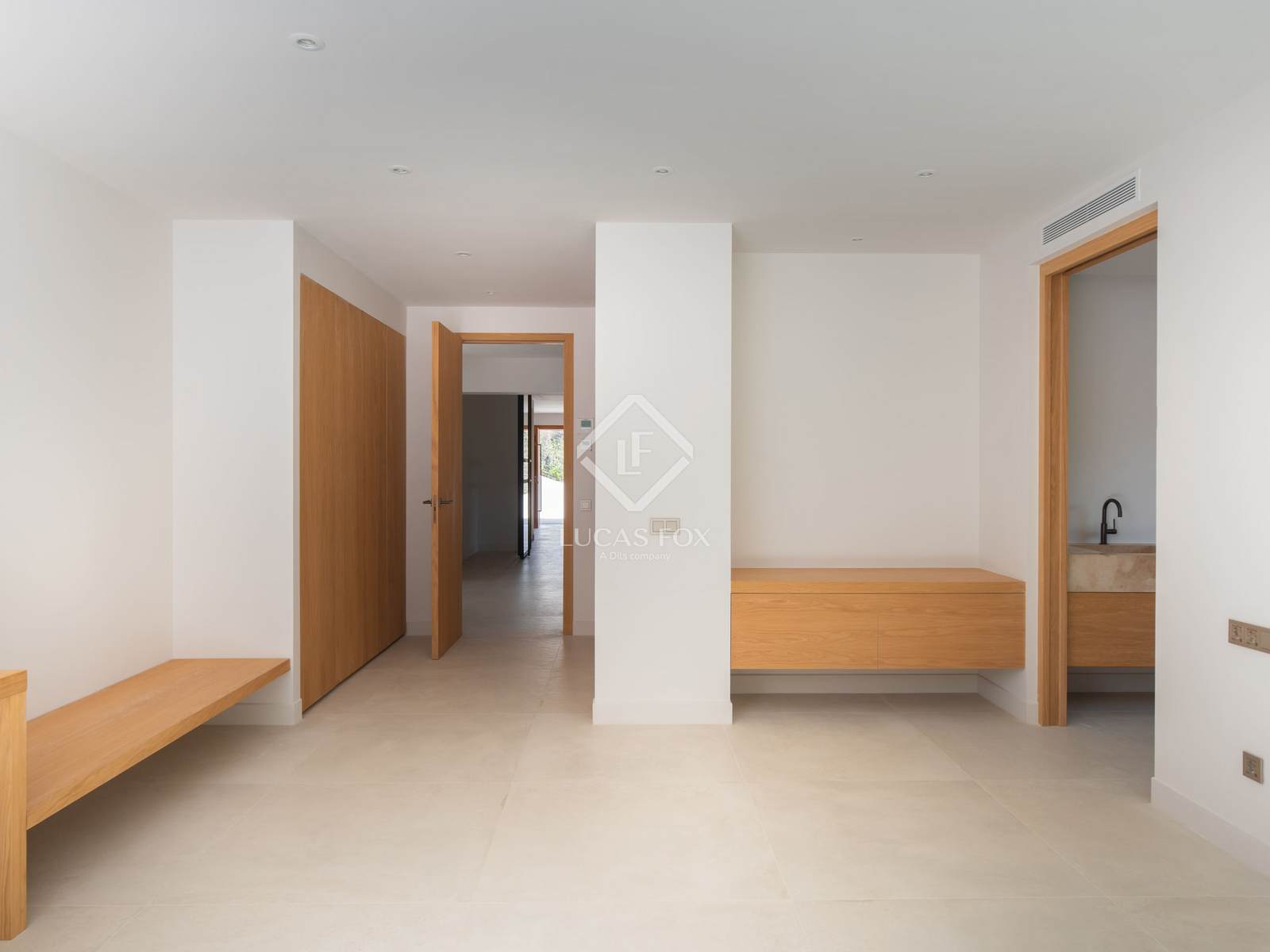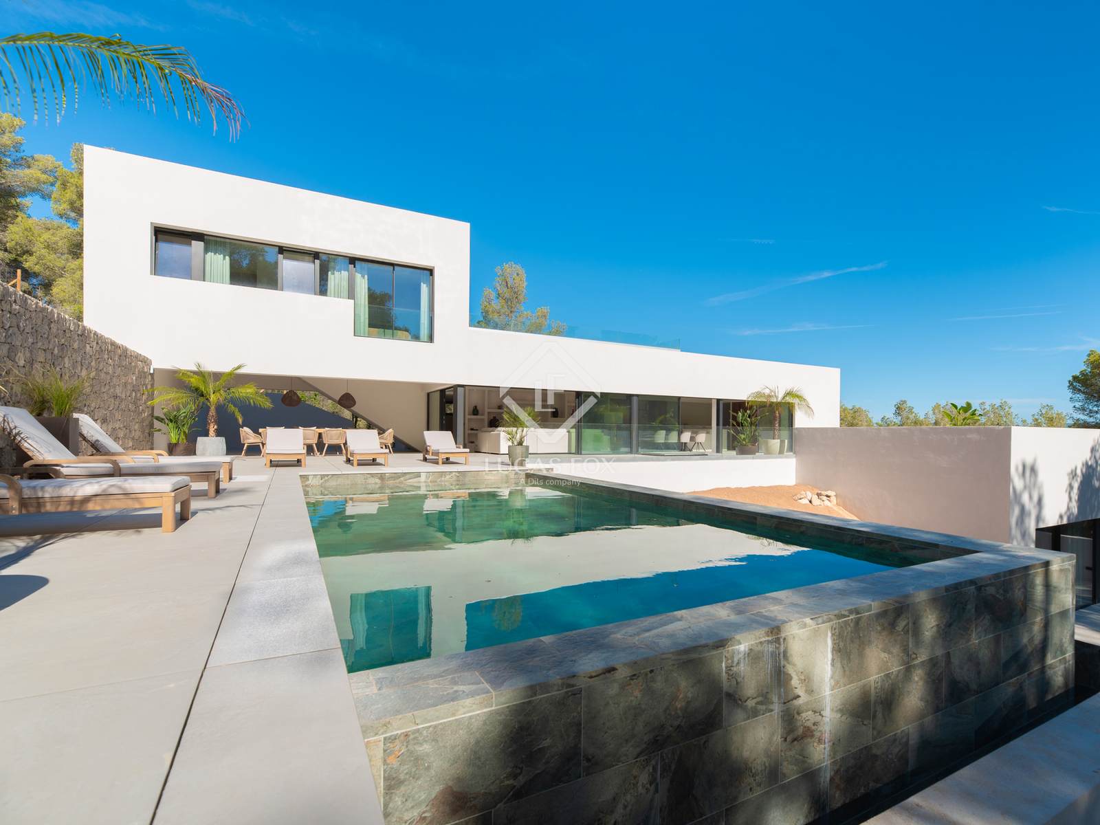 A vila apresenta espaços de estar abertos e iluminados, com grandes janelas do chão ao teto que inundam os interiores com luz natural e oferecem vistas panorâmicas da paisagem exuberante de Ibiza. A sala de estar e jantar em plano aberto se conecta perfeitamente a uma cozinha de designer totalmente equipada, criando um ambiente perfeito para entretenimento.