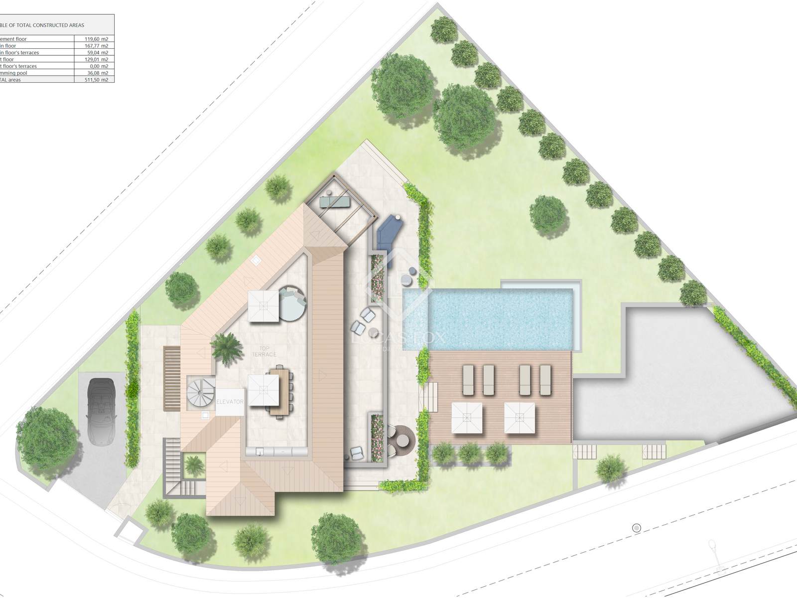 O último andar abriga três quartos, cada um com banheiro e closet, incluindo uma espaçosa suíte master com acesso a um terraço com vistas magníficas. Um terraço na cobertura oferece vistas ainda mais espetaculares para aproveitar o sol com tranquilidade.