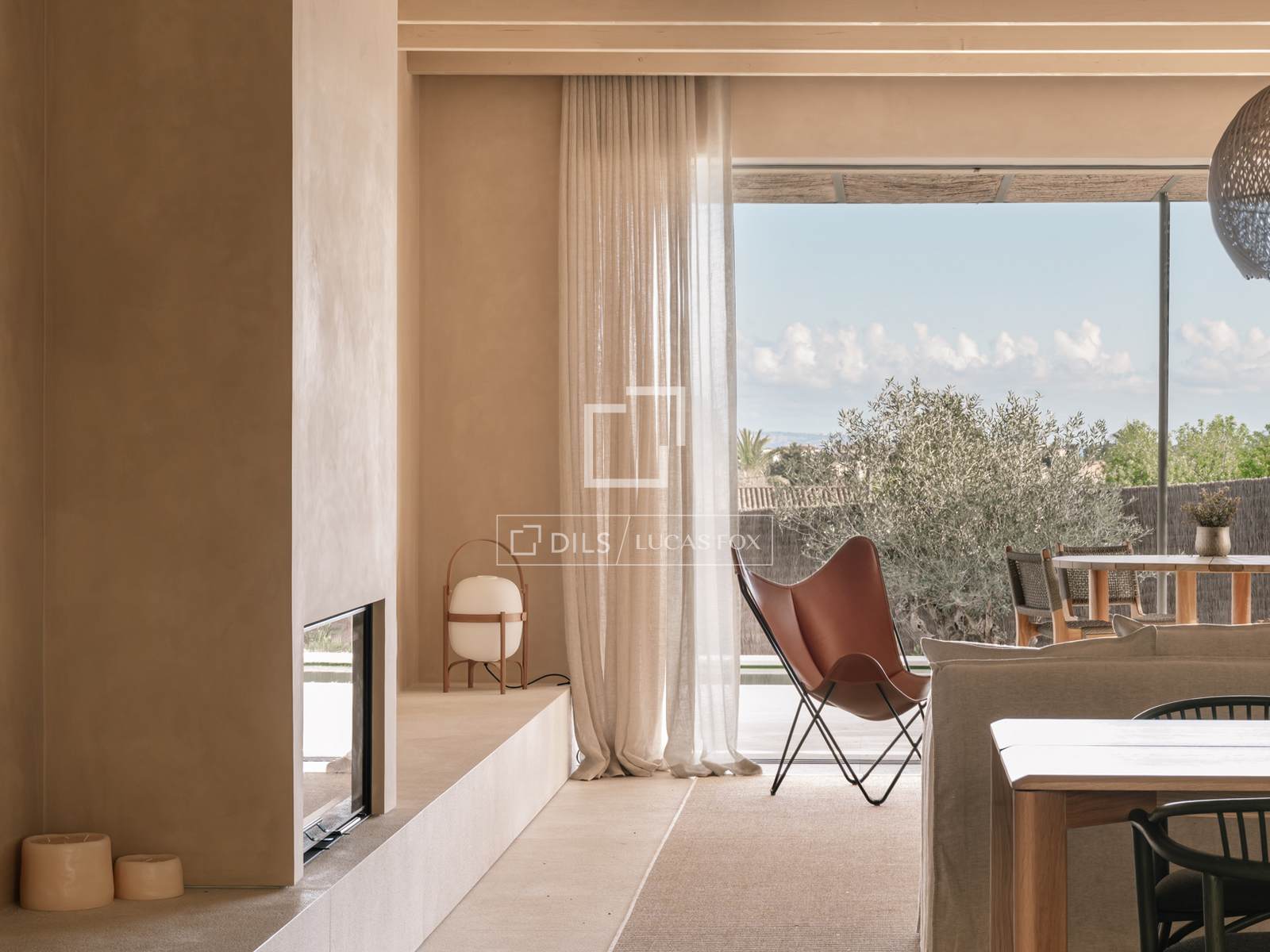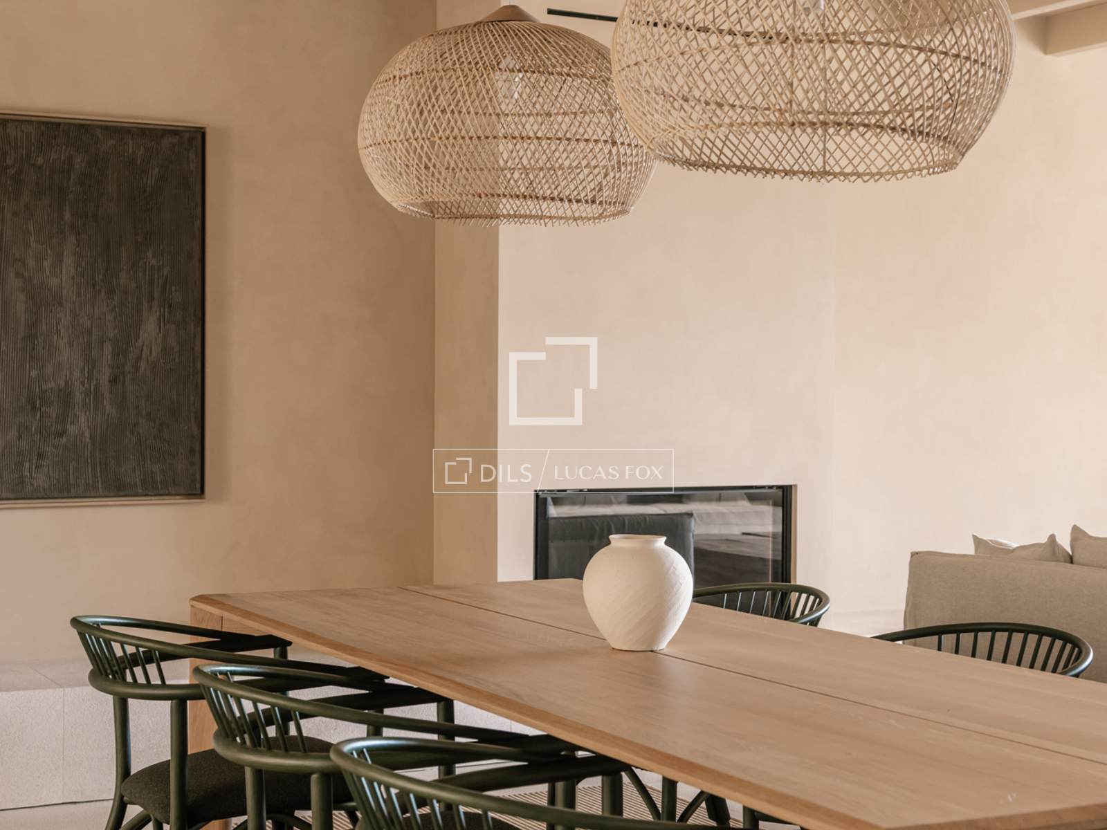 - Lareira: Lareira de ferro preto com 100 cm de largura e porta de vidro guilhotina.