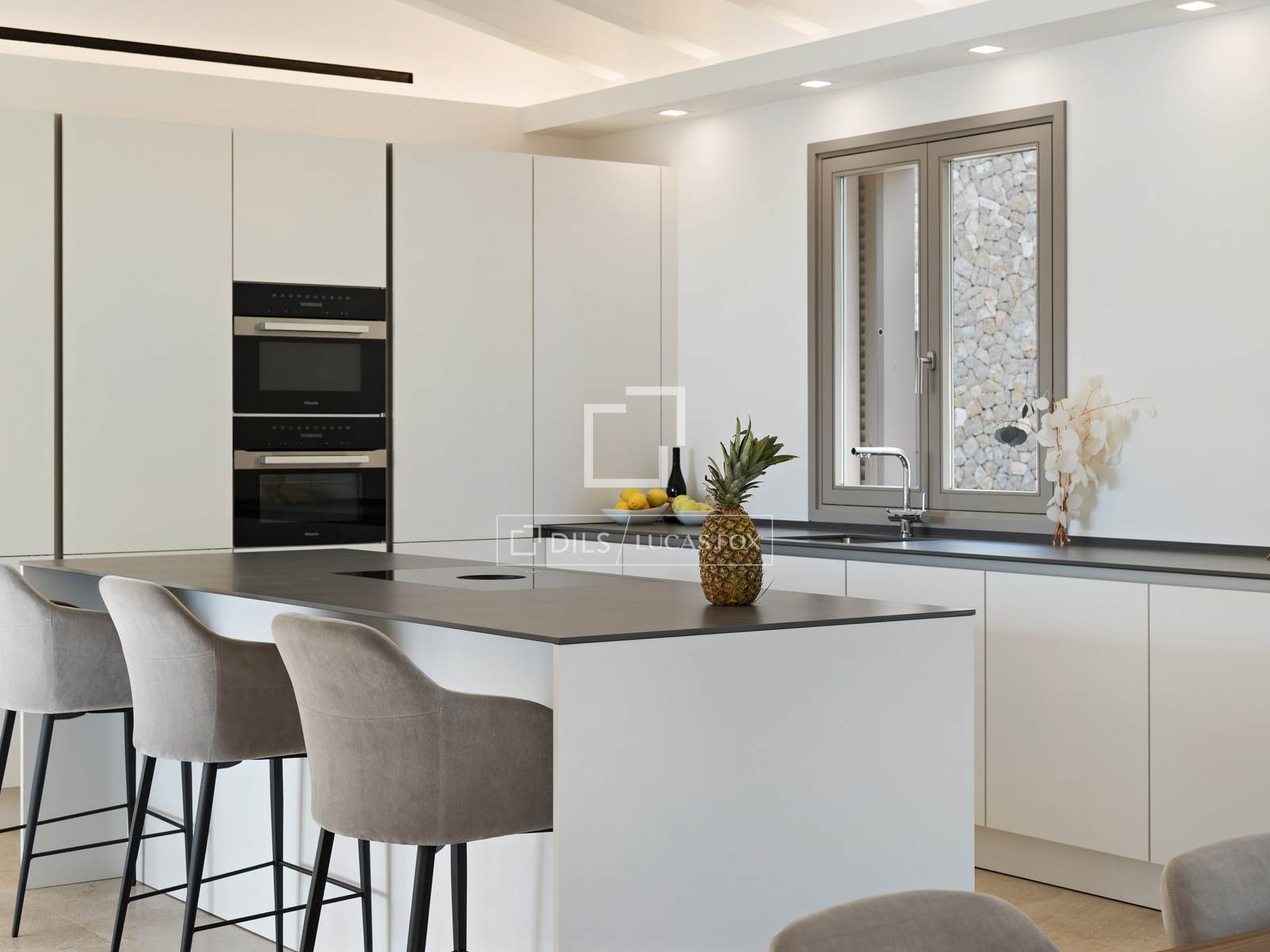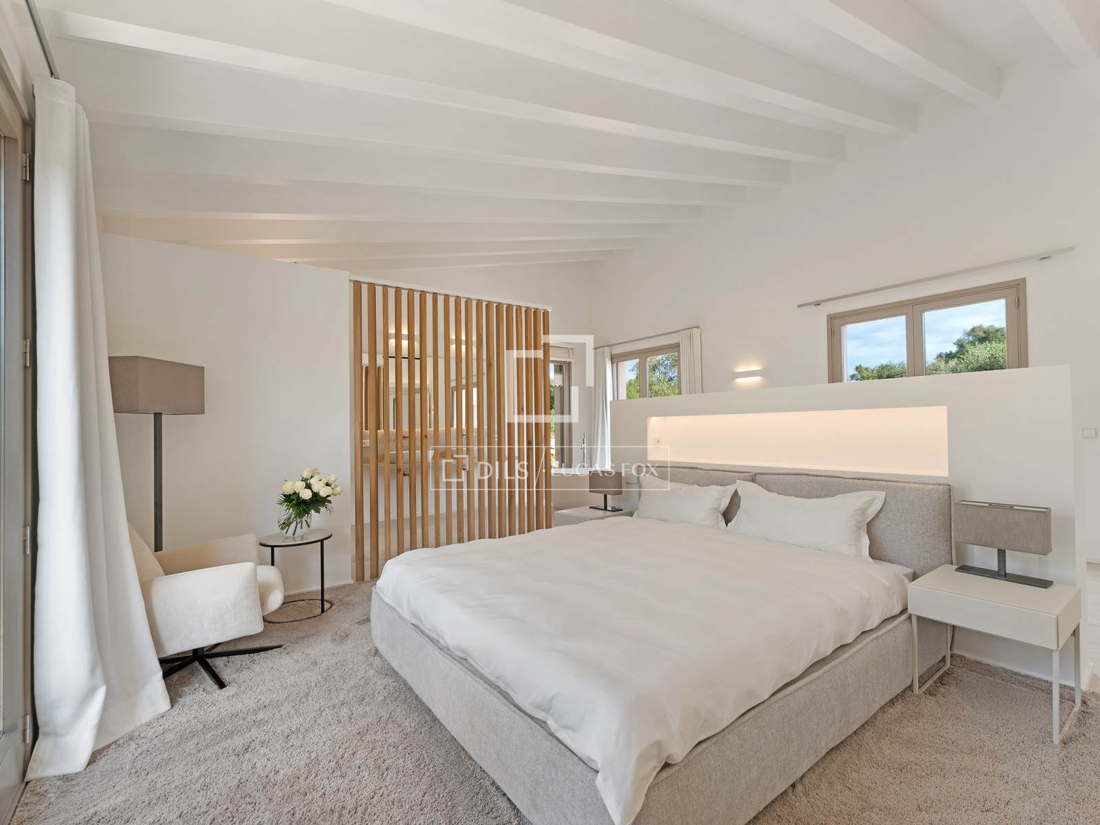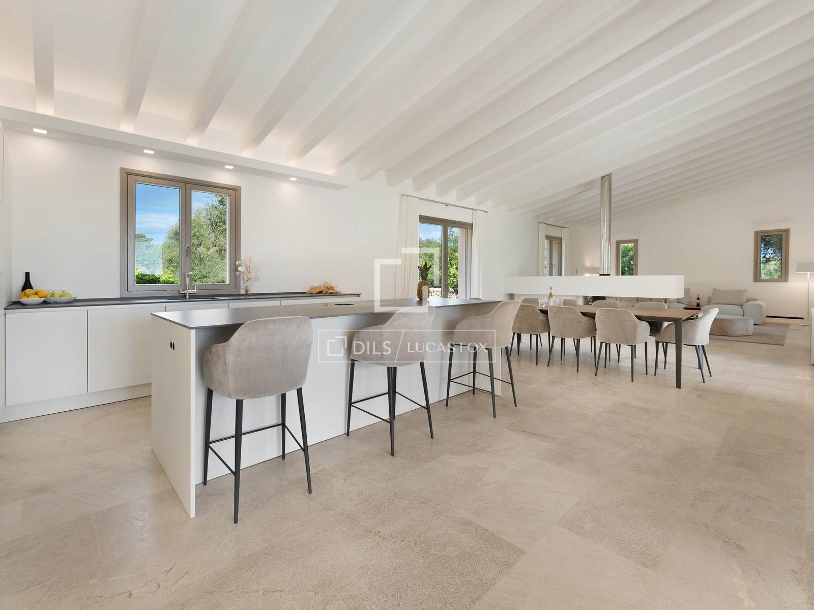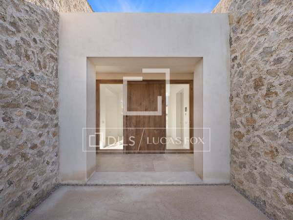 A arquitetura apresenta espaços discretos, porém elegantes, simples e sofisticados, com volumes bem proporcionados e fachadas revestidas em pedra maiorquina, em consonância com a tradição da região. O exterior é complementado por um jardim meticulosamente projetado, terraços em pedra natural com iluminação integrada, um pátio interno e uma grande piscina com deck, criando áreas distintas destinadas ao relaxamento e à vida ao ar livre.