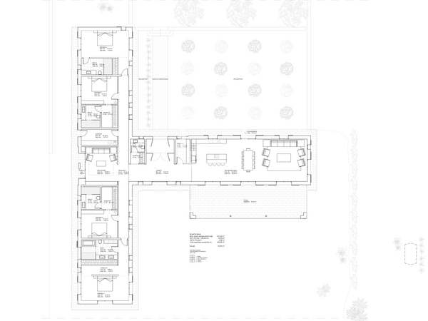 O complexo é complementado por um anexo restaurado com diversas possibilidades de uso (ginásio, cinema, estúdio de ioga, etc.), organizado em torno de um pátio com um poço original restaurado. Os jardins foram projetados segundo princípios rigorosos de paisagismo, incorporando lagos, áreas verdes e uma piscina de aproximadamente 75 m², rodeada por terraços de pedra natural e também áreas cobertas para uso diário.