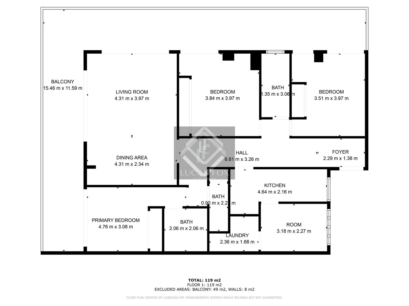 3 quartos, 2 casas de banho das quais uma suite, todos os quartos com acesso à varanda, cozinha, sala de estar, sala de jantar