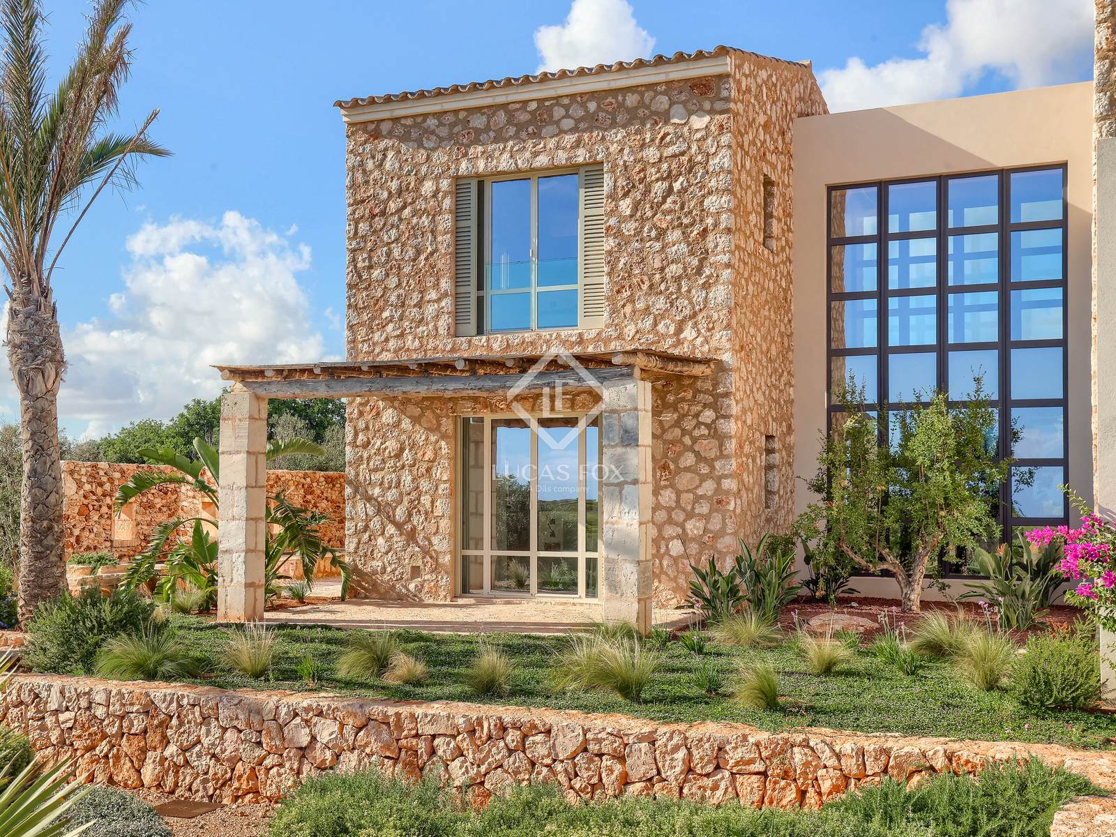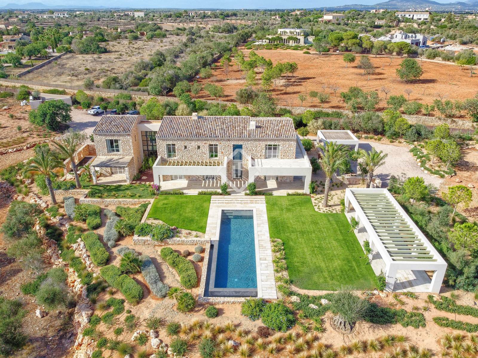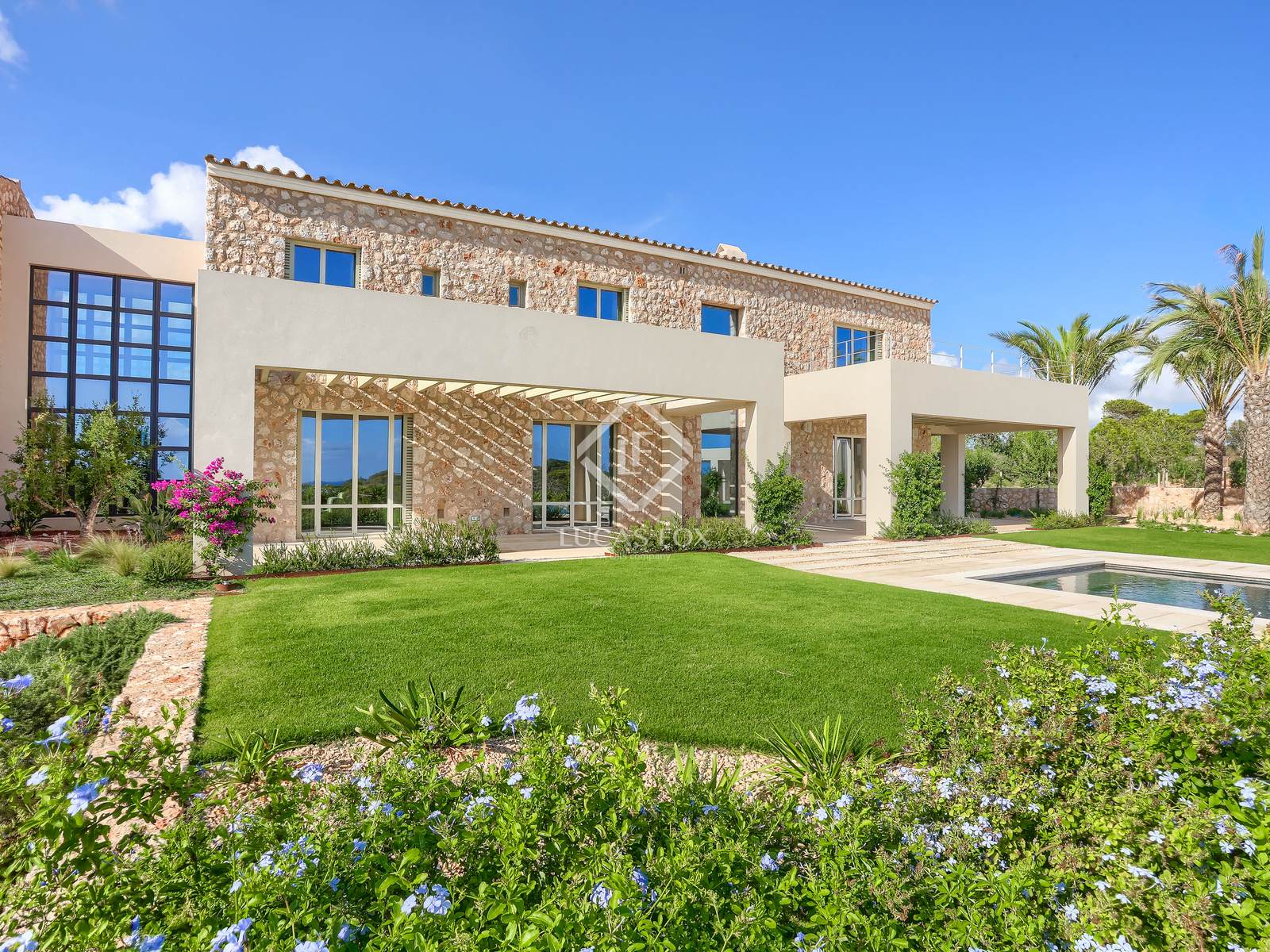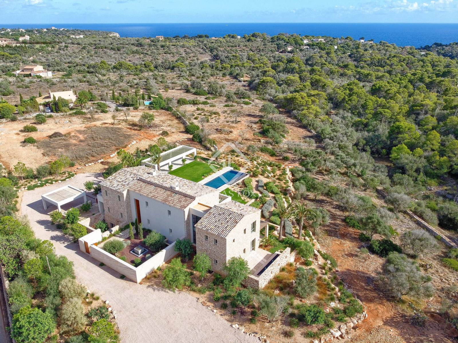 Elegante vila nova em terreno de 15.000 m², com 6 quartos com banheiro privativo, áreas de estar espaçosas, terraços, piscina e jardins paisagísticos com oliveiras e árvores cítricas, a poucos minutos de Cala Llombards.