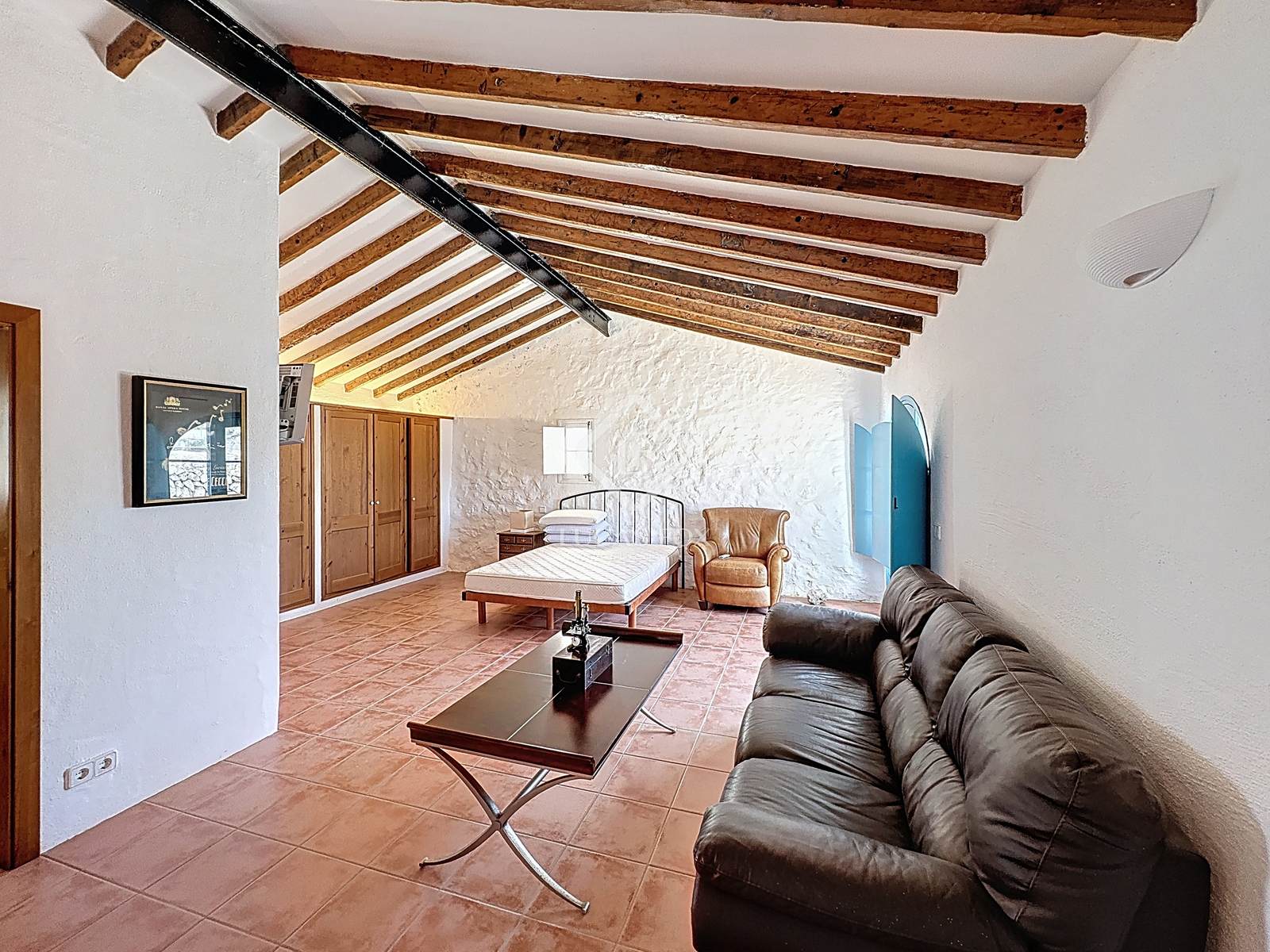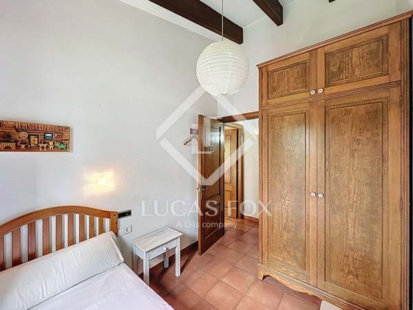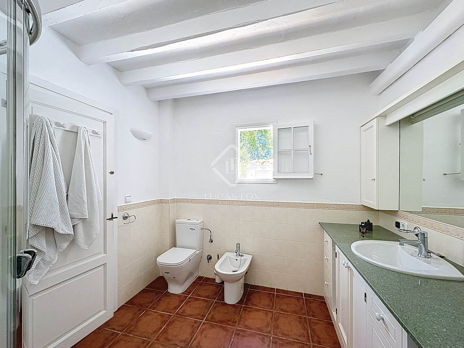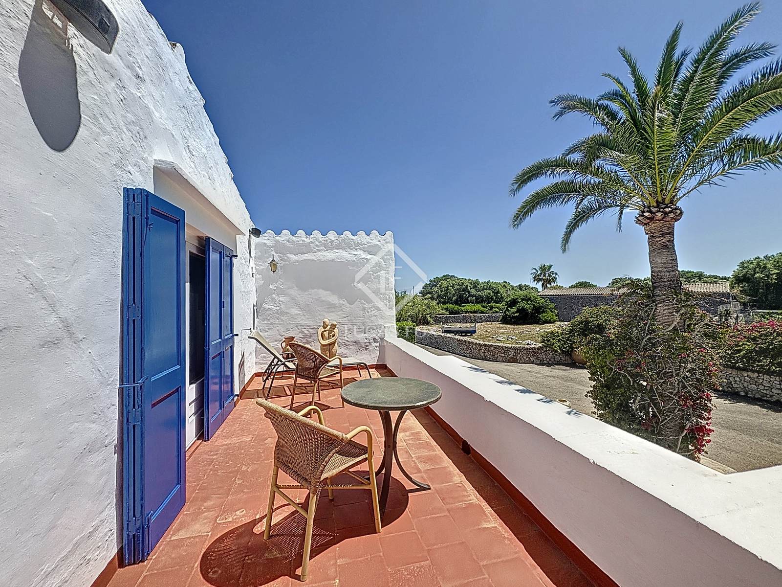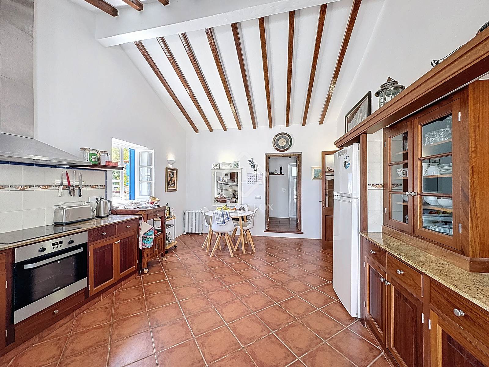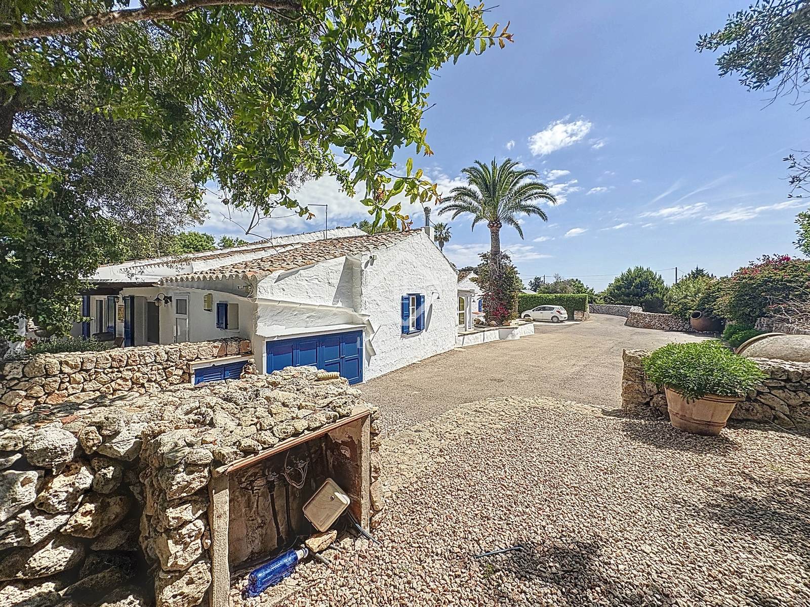 Ao entrar no terreno, encontramos um amplo jardim e uma área de estacionamento. A casa principal está distribuída no térreo. Através de um alpendre típico de Menorca, acessamos a entrada com dois quartos de casal e dois banheiros completos. Alguns degraus levam ao quarto principal com um amplo terraço, dois closets e um banheiro completo. Do outro lado, há uma sala de estar e jantar espaçosa e iluminada que se abre para uma cozinha reformada. Atravessando a cozinha, chegamos a uma área nos fundos. Aqui, há um amplo terraço com piscina privativa e chuveiro externo.