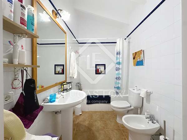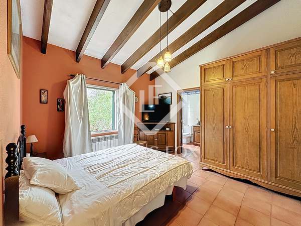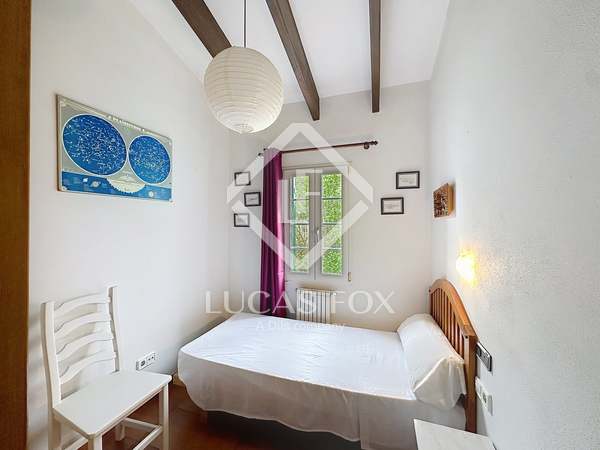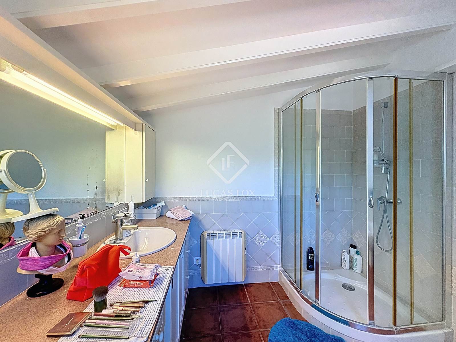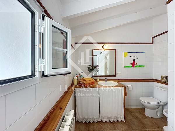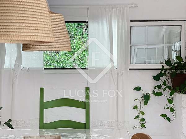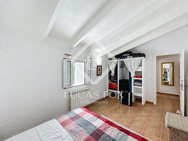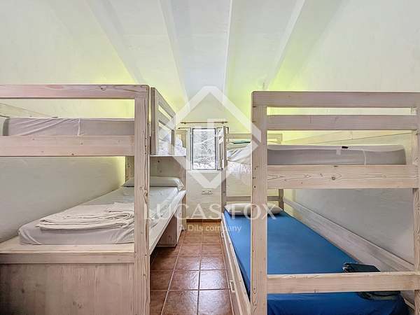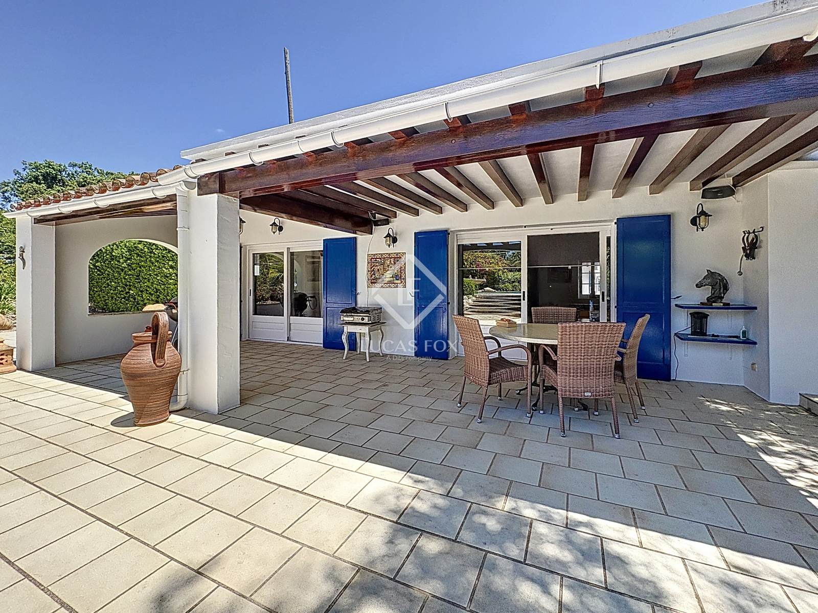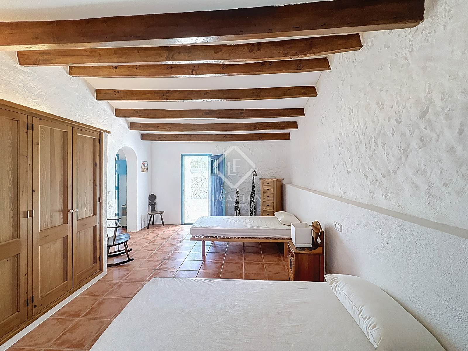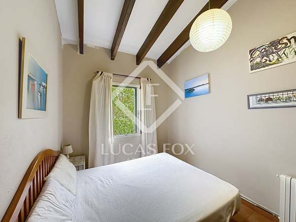 Ao entrar no terreno, encontramos um amplo jardim e uma área de estacionamento. A casa principal está distribuída no térreo. Através de um alpendre típico de Menorca, acessamos a entrada com dois quartos de casal e dois banheiros completos. Alguns degraus levam ao quarto principal com um amplo terraço, dois closets e um banheiro completo. Do outro lado, há uma sala de estar e jantar espaçosa e iluminada que se abre para uma cozinha reformada. Atravessando a cozinha, chegamos a uma área nos fundos. Aqui, há um amplo terraço com piscina privativa e chuveiro externo.