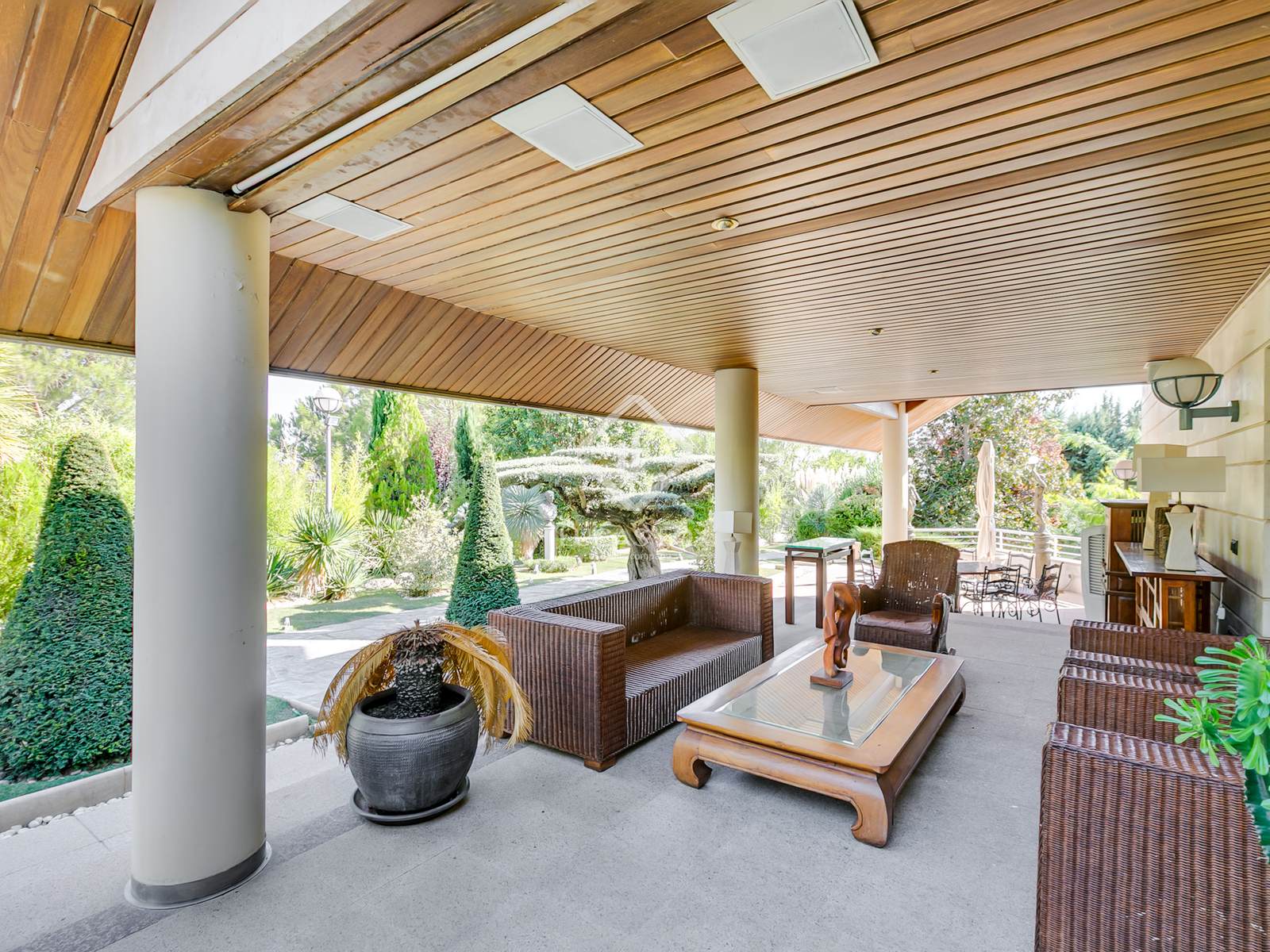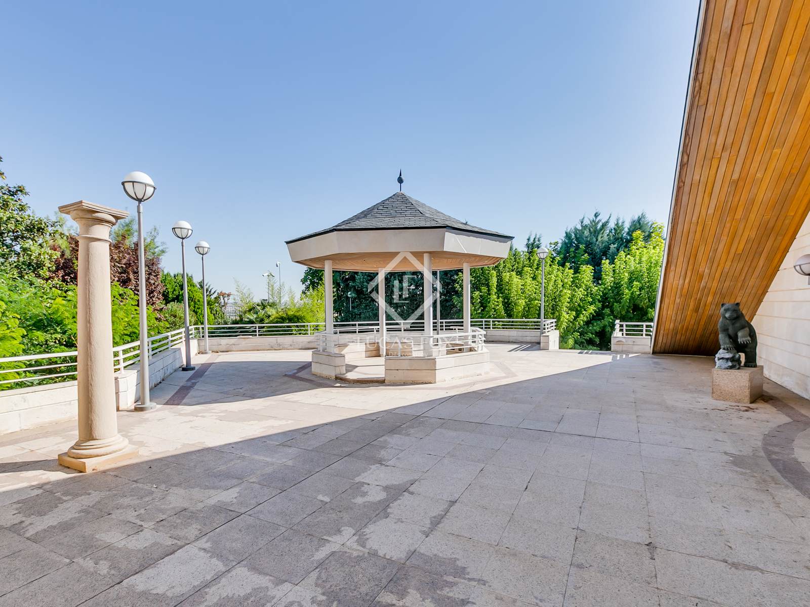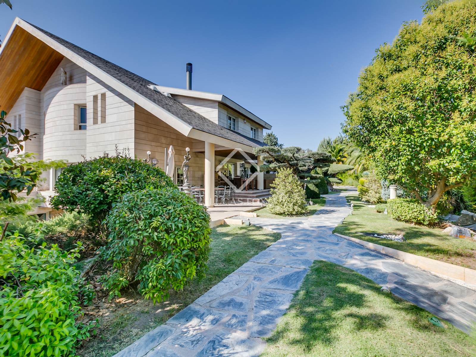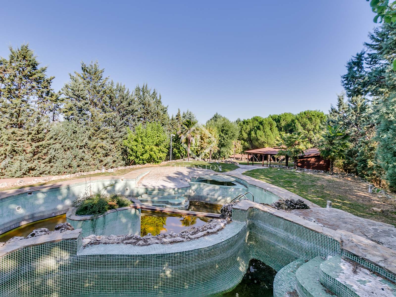 Ao entrar, encontramos um caminho privado ladeado por jardins maduros, árvores centenárias, fontes e iluminação ambiente que nos leva à majestosa casa, com vistas deslumbrantes da Serra de Madrid.