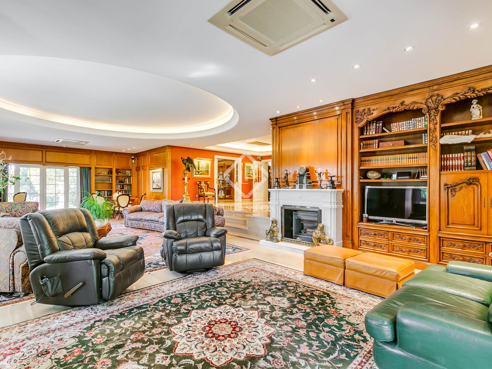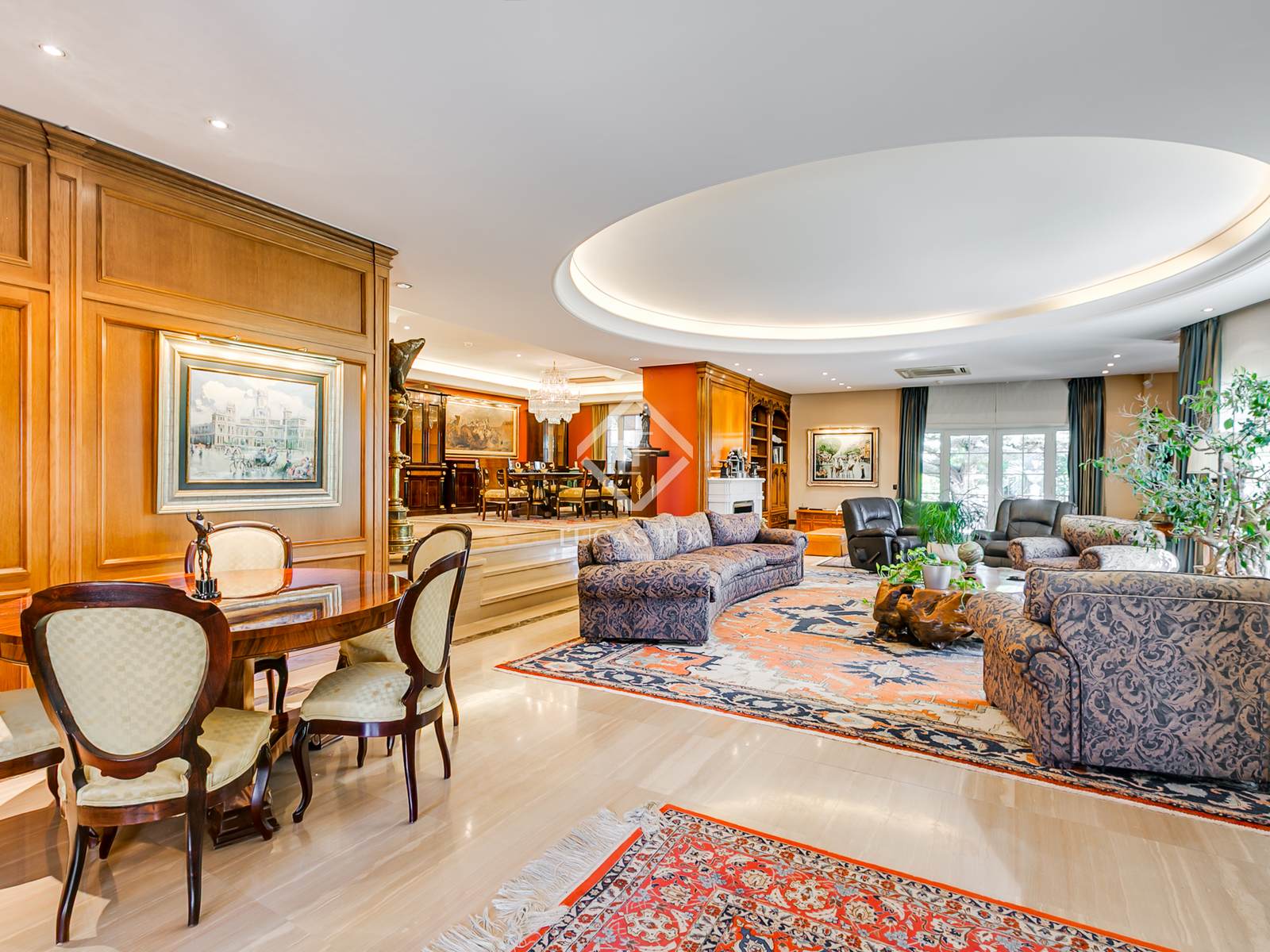 - Sala de estar principal em dois níveis com lareira e acesso direto ao jardim