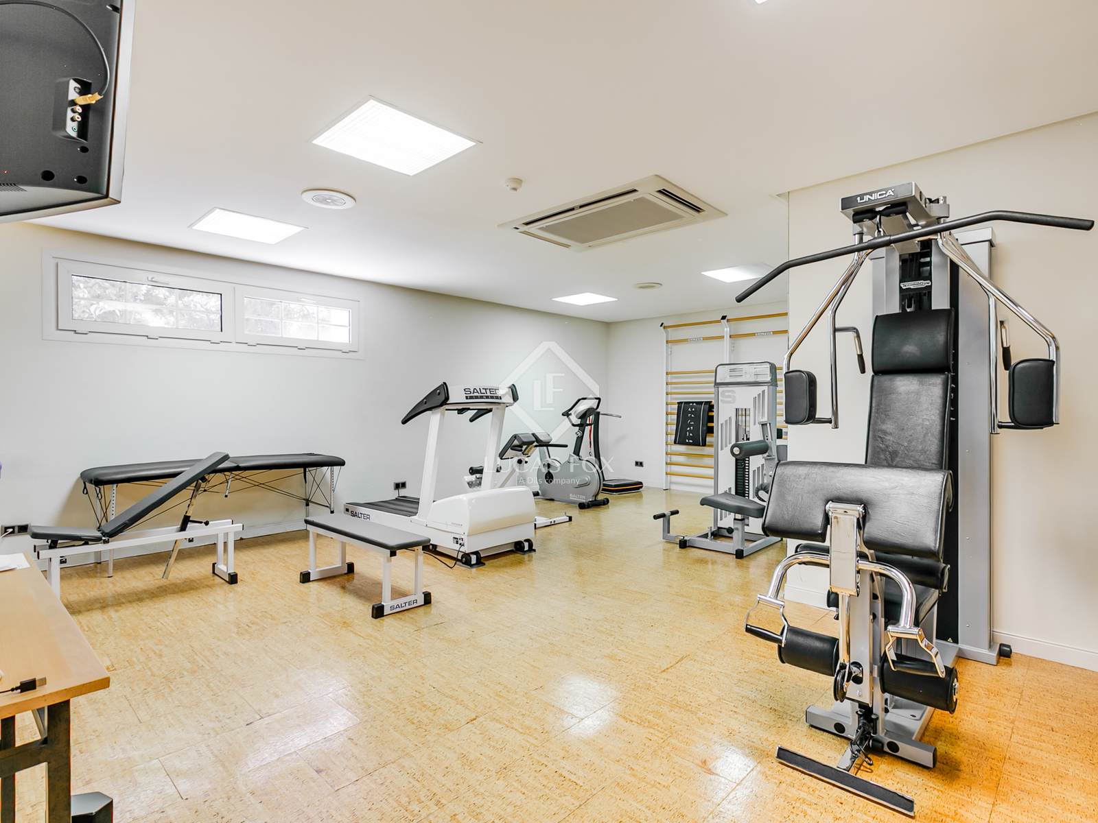 No andar inferior, há uma piscina coberta aquecida, uma academia profissional, uma sauna com solário, uma adega climatizada, uma sala de cinema, uma discoteca privativa com isolamento acústico e uma quadra de squash.