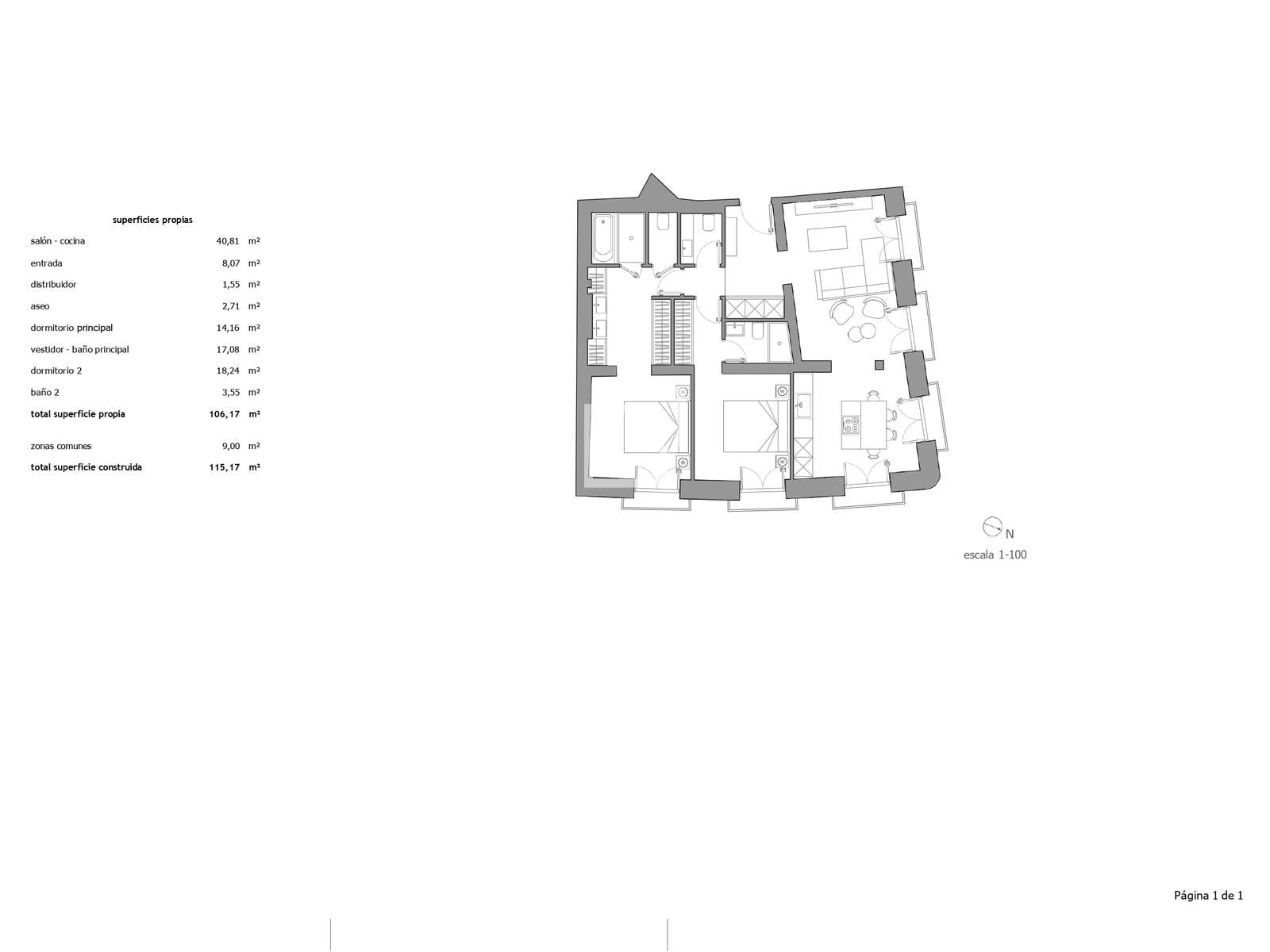- Área total construída: 115,17 m²