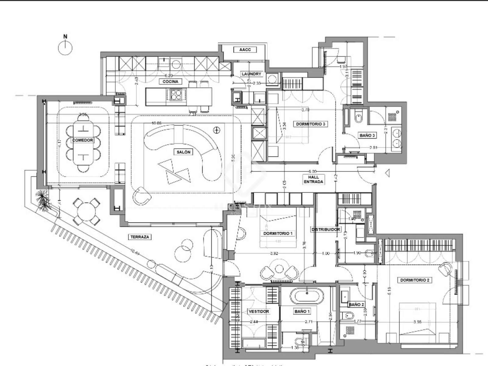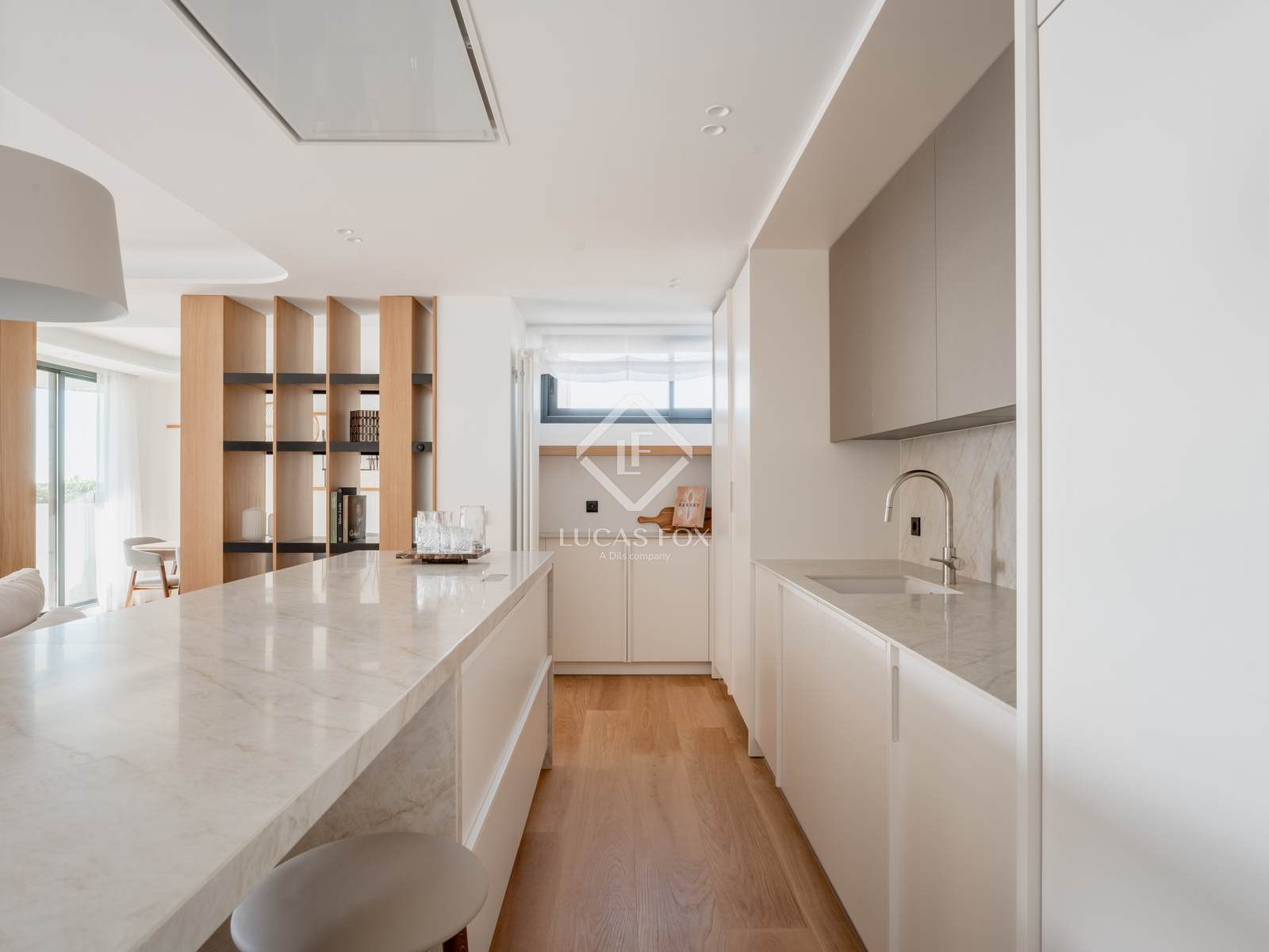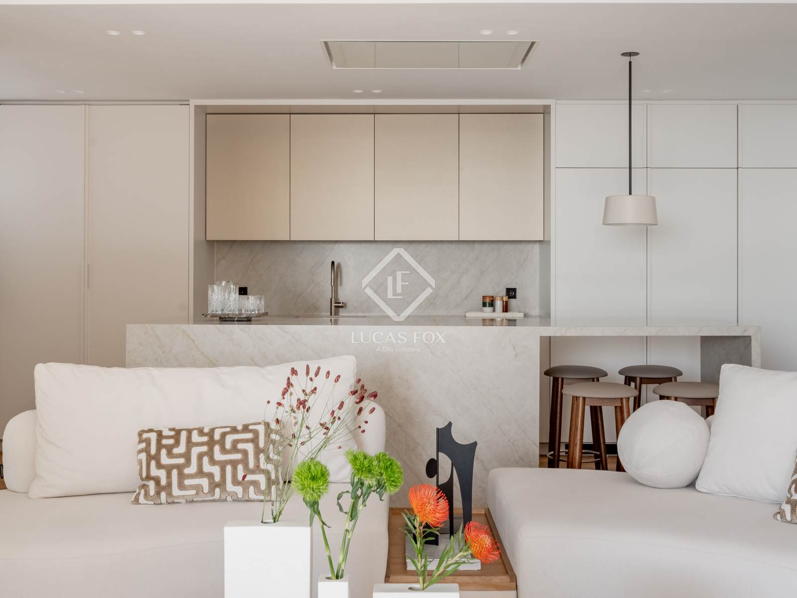 Durante a reforma, o terraço original foi restaurado e transformado em um espetacular espaço social com paisagismo, vegetação integrada e mobiliário personalizado. A área de estar é organizada como um amplo espaço aberto que conecta a sala de estar, a sala de jantar e a cozinha com uma ilha central, equipada com eletrodomésticos de última geração e uma área de serviço separada.