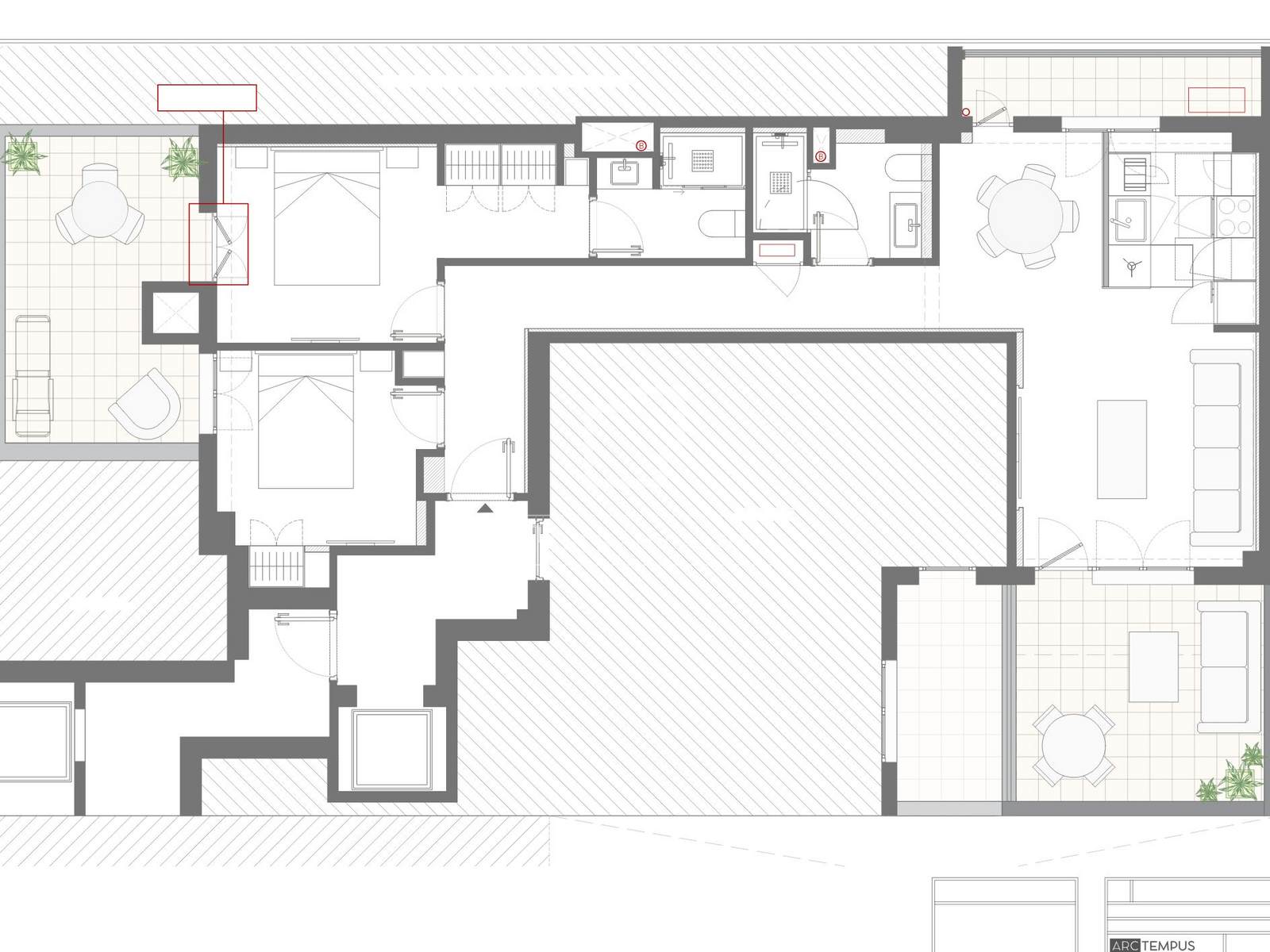 O apartamento está localizado no primeiro andar, com vista para um pátio interno, garantindo tranquilidade e privacidade no coração da cidade. Possui uma área de 105 m² e foi reformado pelo renomado escritório de arquitetura Arctempus, oferecendo um design contemporâneo e acabamentos de alta qualidade.