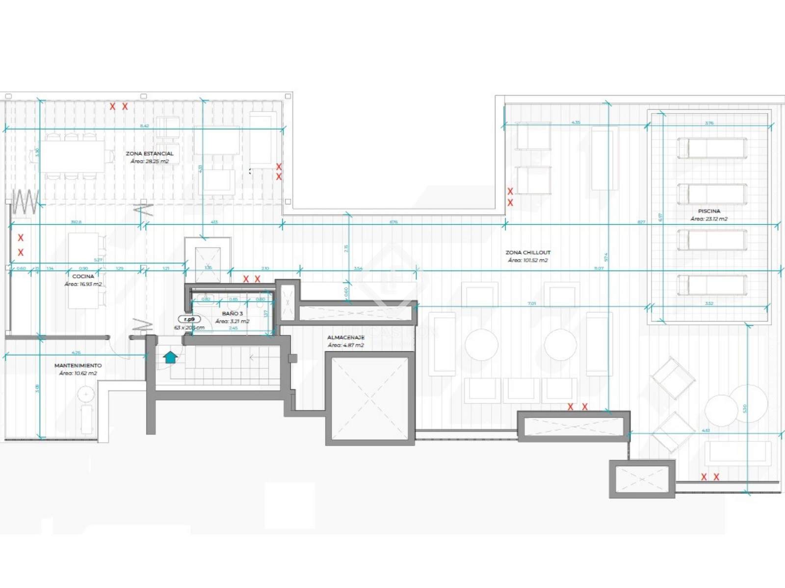 No andar superior, encontramos um espetacular terraço de 188 m², projetado para desfrutar da companhia de familiares e amigos. Este espaço privilegiado conta com uma elegante cozinha integrada, sala de jantar, banheiro social, ampla área de relaxamento e piscina, tudo isso acompanhado de vistas deslumbrantes e desobstruídas do horizonte de Madri.