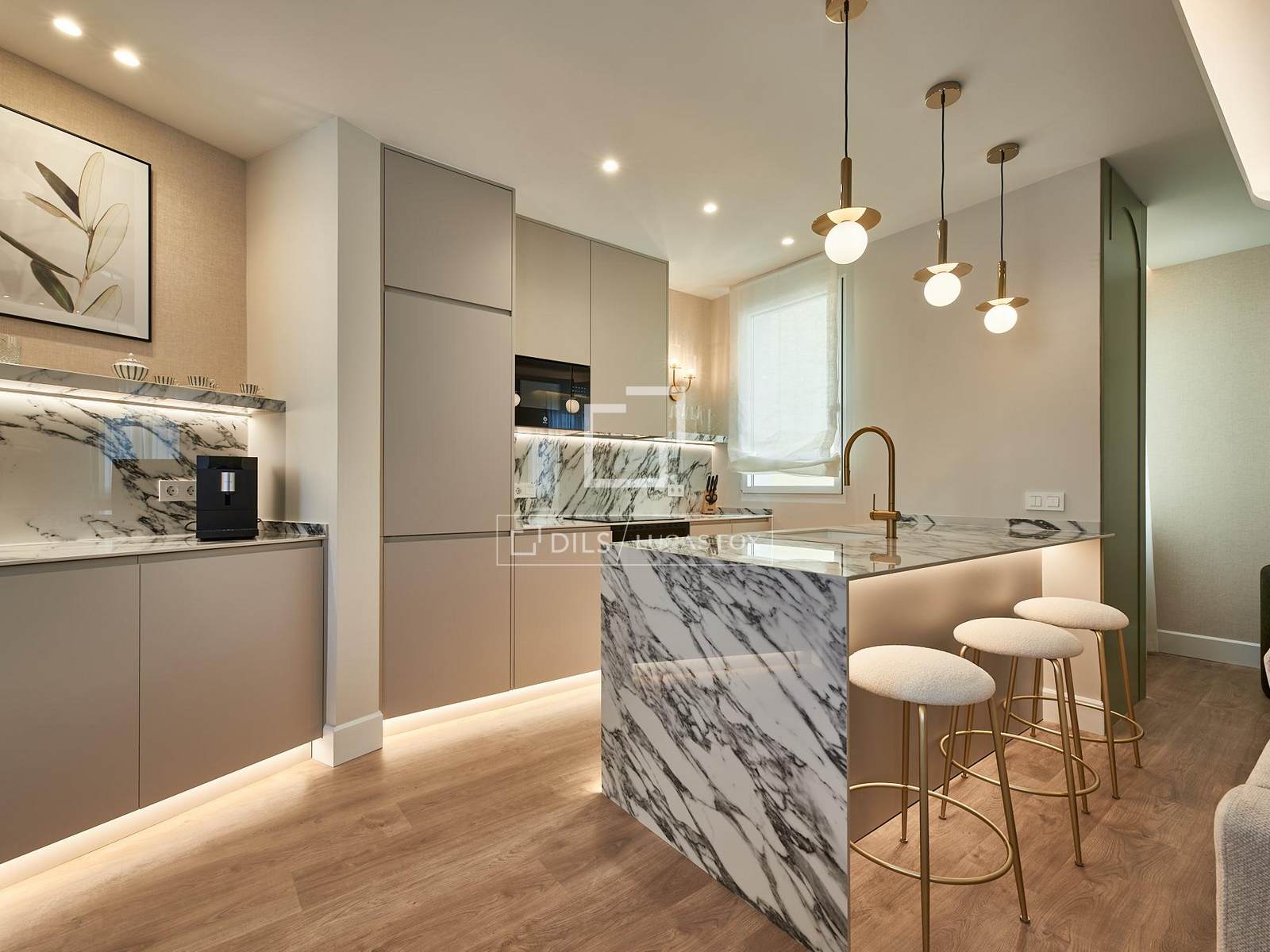 O apartamento dispõe de dois quartos duplos espaçosos e duas casas de banho completas. A área social oferece uma confortável sala de estar/jantar com iluminação bem planejada e acabamentos de alta qualidade, além de uma cozinha totalmente equipada. O imóvel conta com aquecimento individual a gás e ar condicionado central, garantindo conforto absoluto durante todo o ano.
