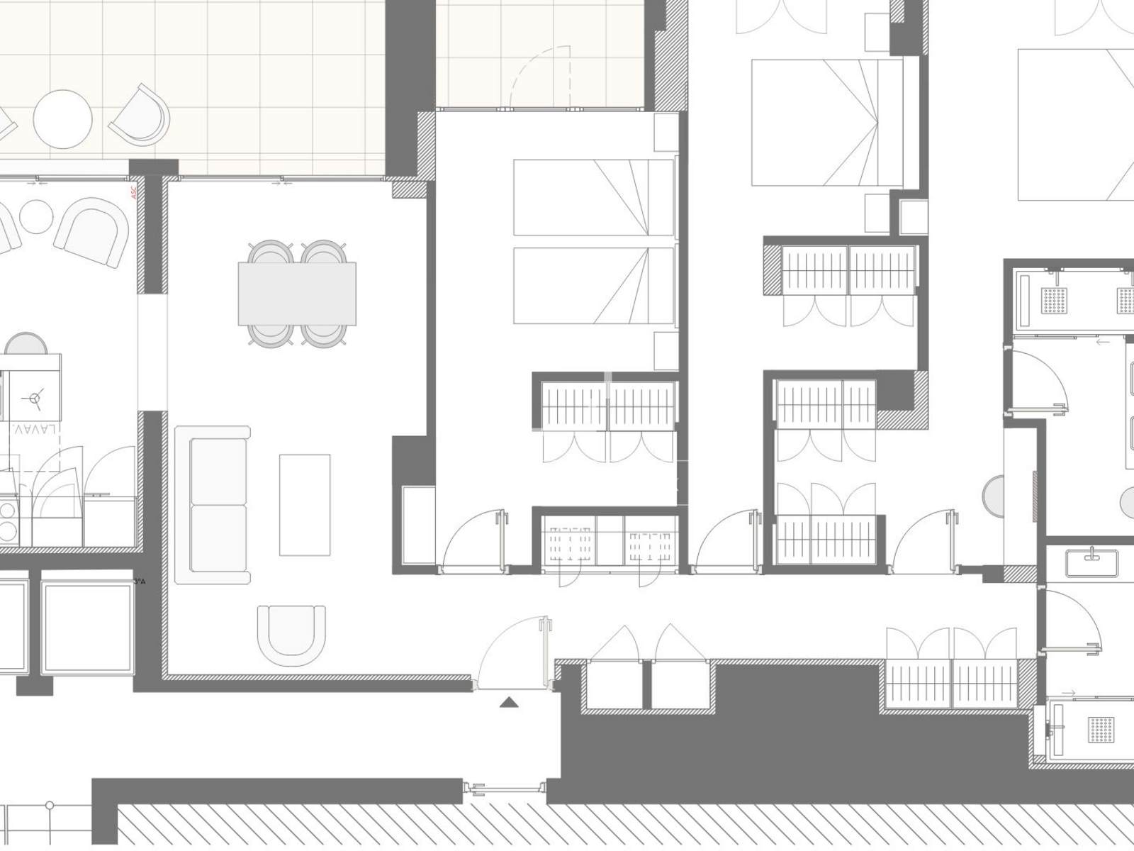 O imóvel está localizado no terceiro andar de um prédio com elevador. Oferece 117 m² de área útil (133 m² de área construída e 150 m² de acordo com o registro imobiliário) e uma excelente distribuição. O apartamento conta com três quartos com armários embutidos, dois banheiros completos com box e vaso sanitário suspenso, além de uma sala de estar/jantar ampla e iluminada com acesso a um terraço.