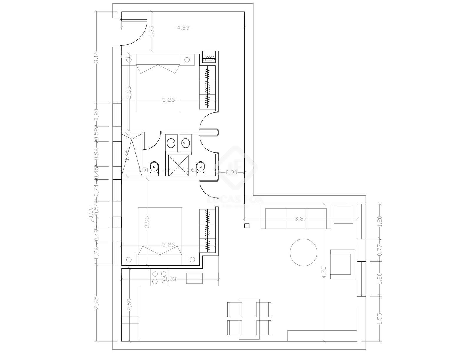 A espaçosa e convidativa sala de estar conta com uma cozinha moderna e integrada. O layout é complementado por um quarto de casal, um banheiro completo e uma elegante suíte principal com banheiro privativo.