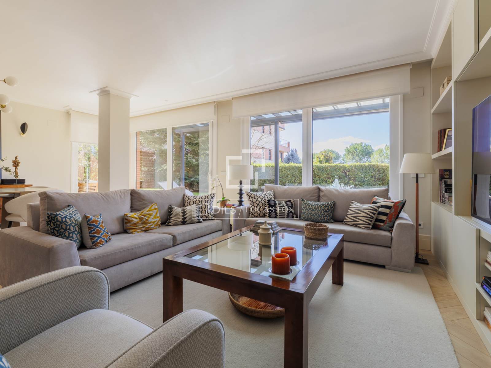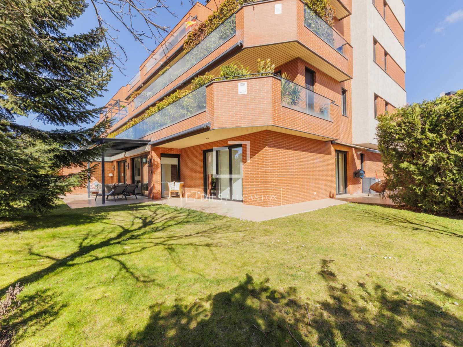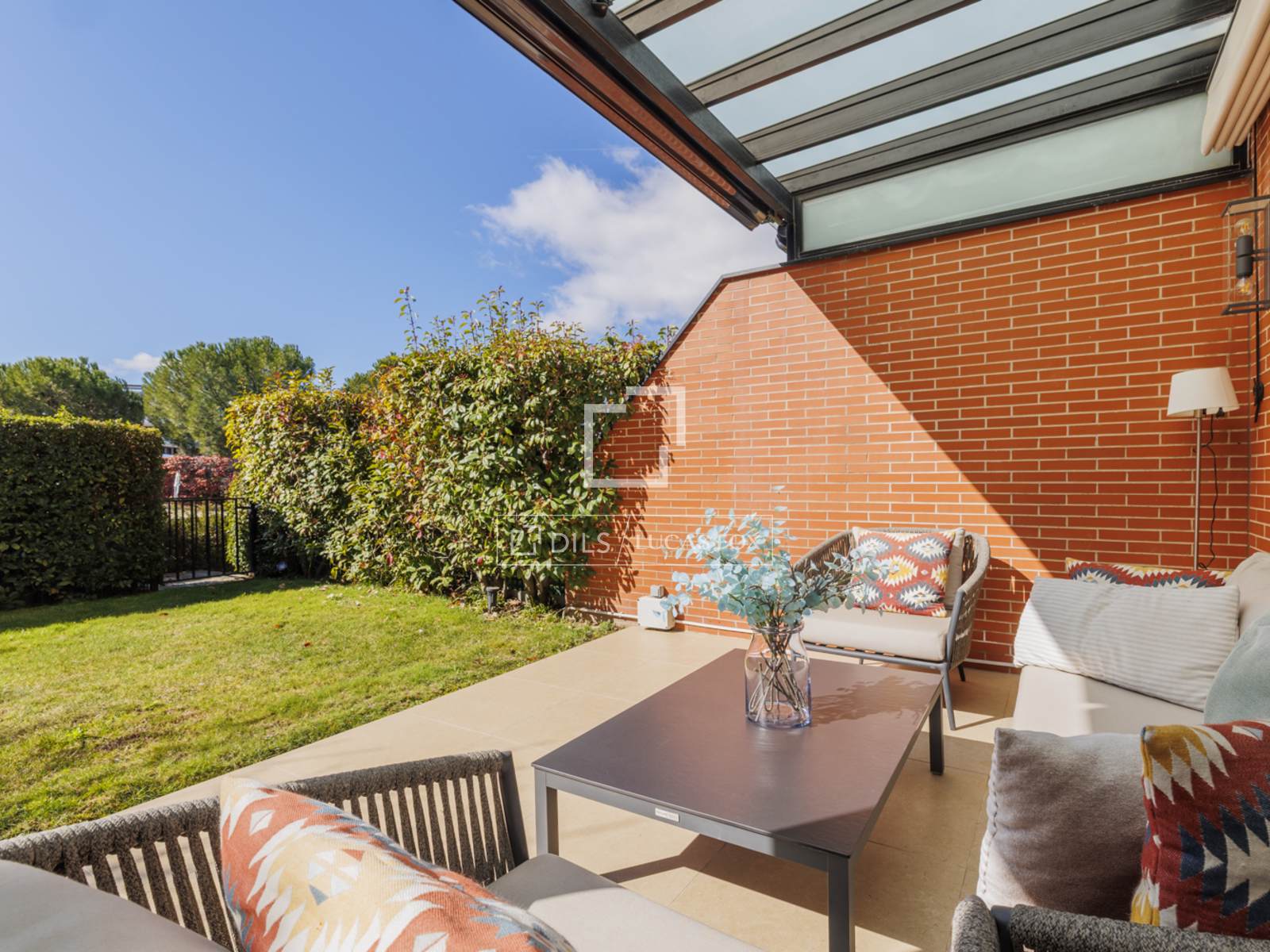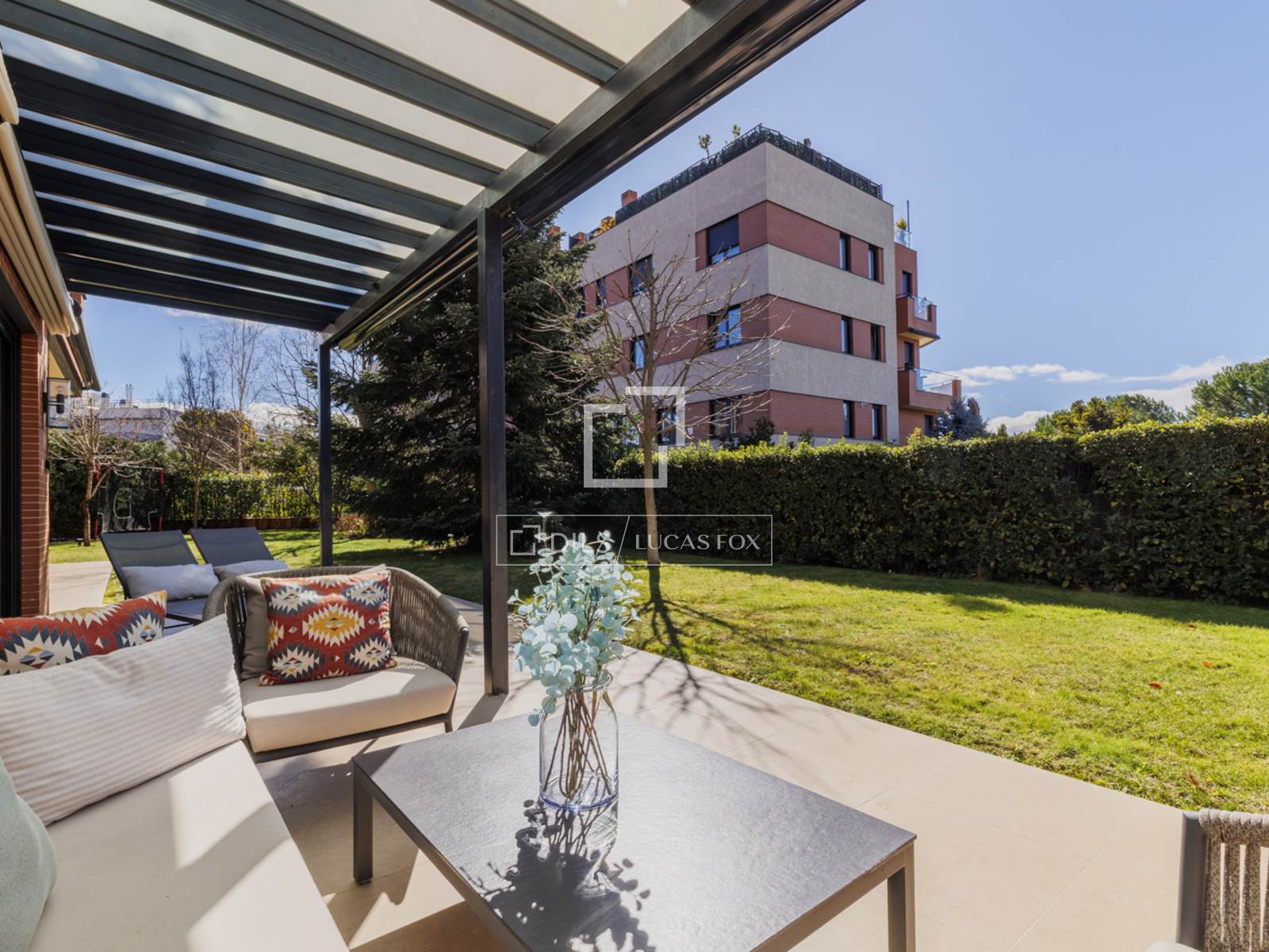Apartamento térreo exclusivo e sofisticado, com um espetacular jardim de 350 metros quadrados que circunda a casa e orientação sudeste, à venda em um condomínio moderno em Somosaguas, com piscina interna e externa e academia privativa.