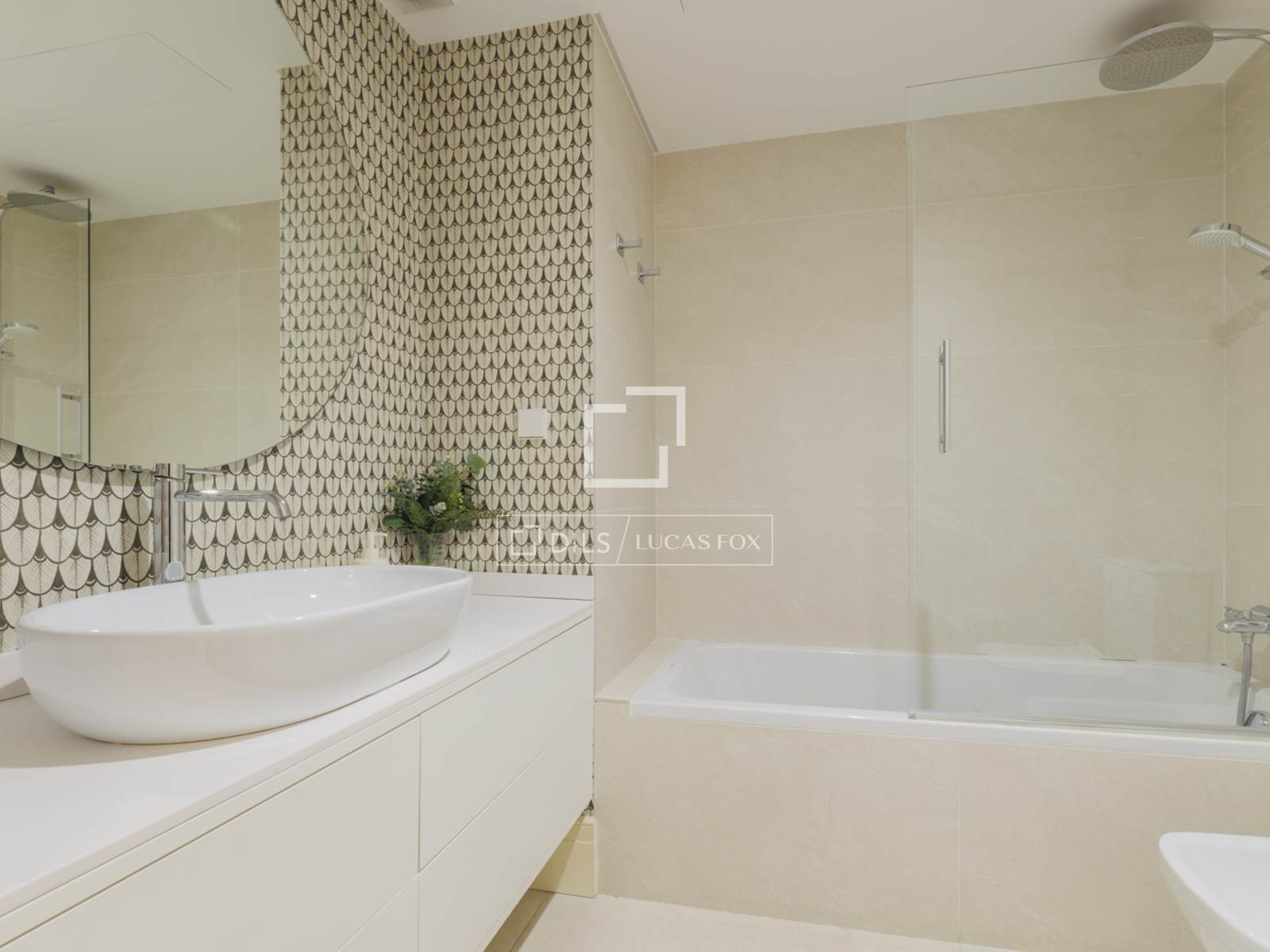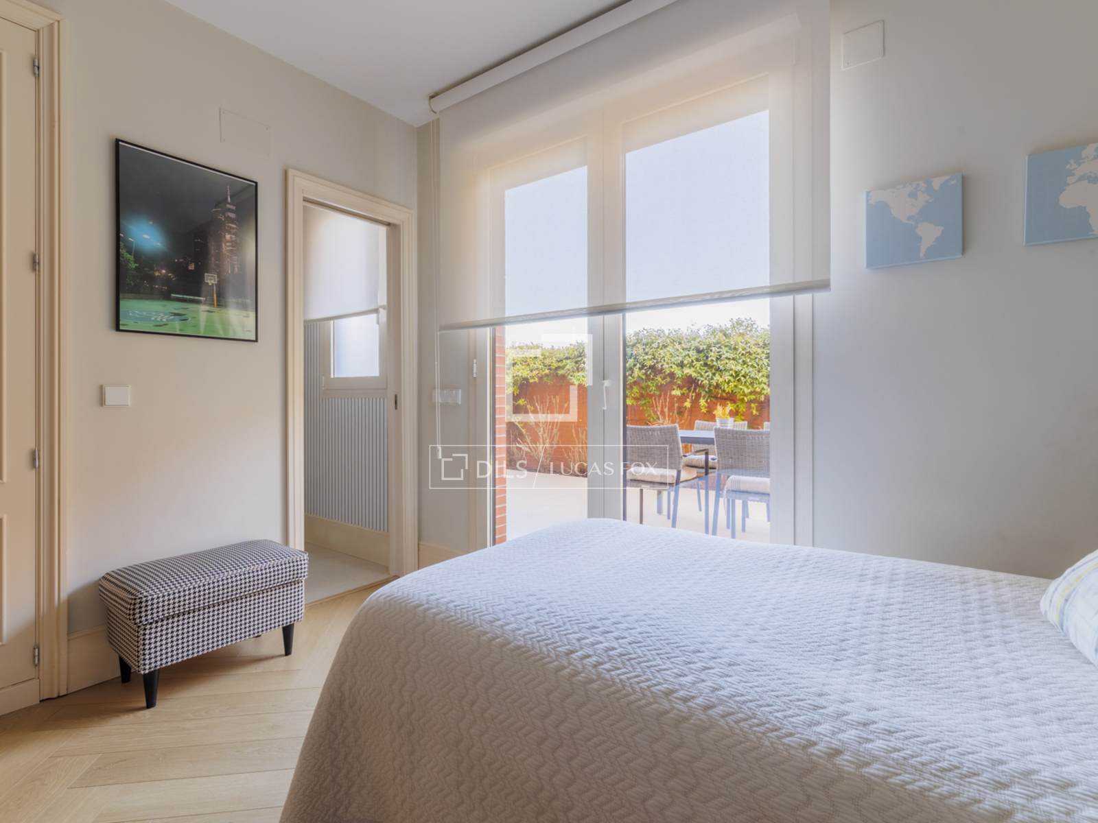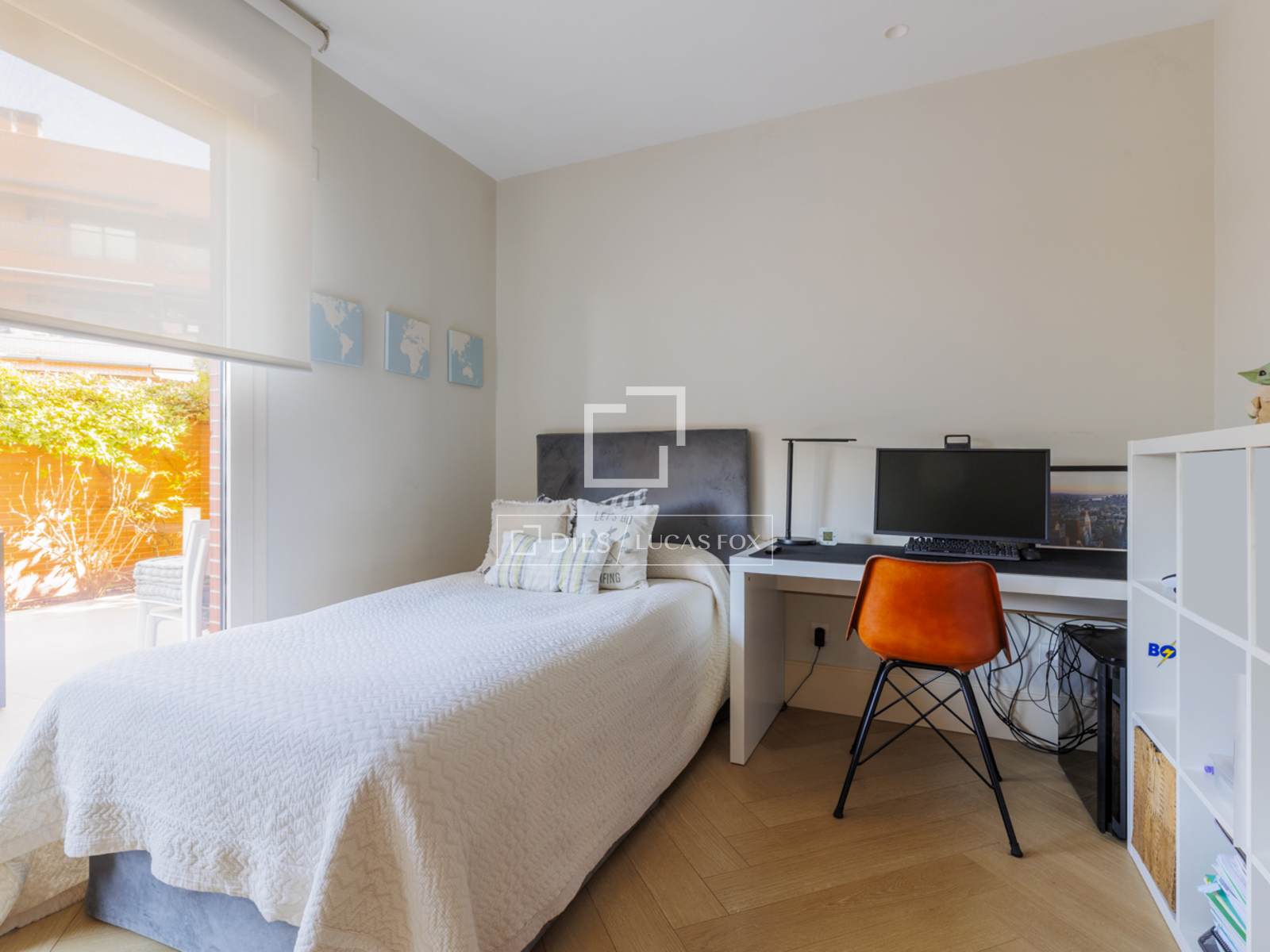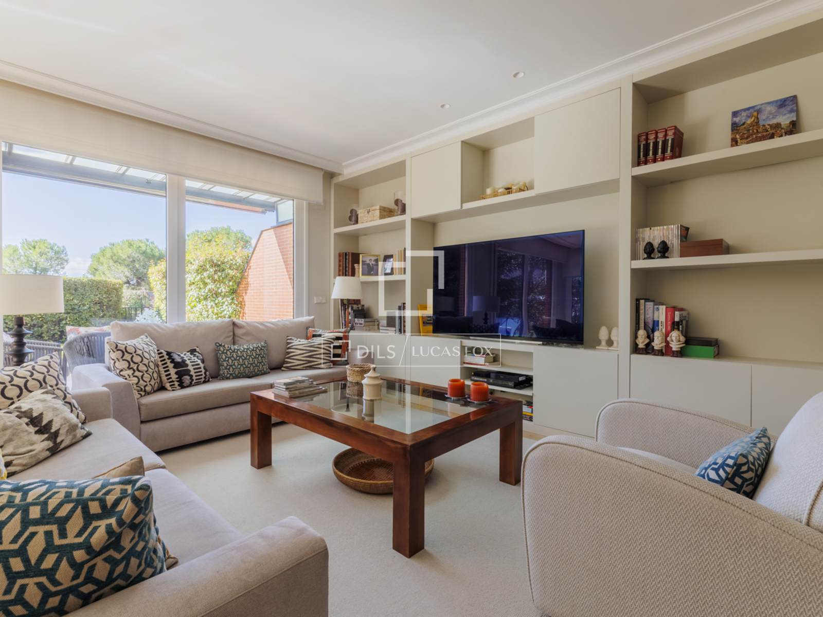 Apartamento térreo exclusivo e sofisticado, com um espetacular jardim de 350 metros quadrados que circunda a casa e orientação sudeste, à venda em um condomínio moderno em Somosaguas, com piscina interna e externa e academia privativa.