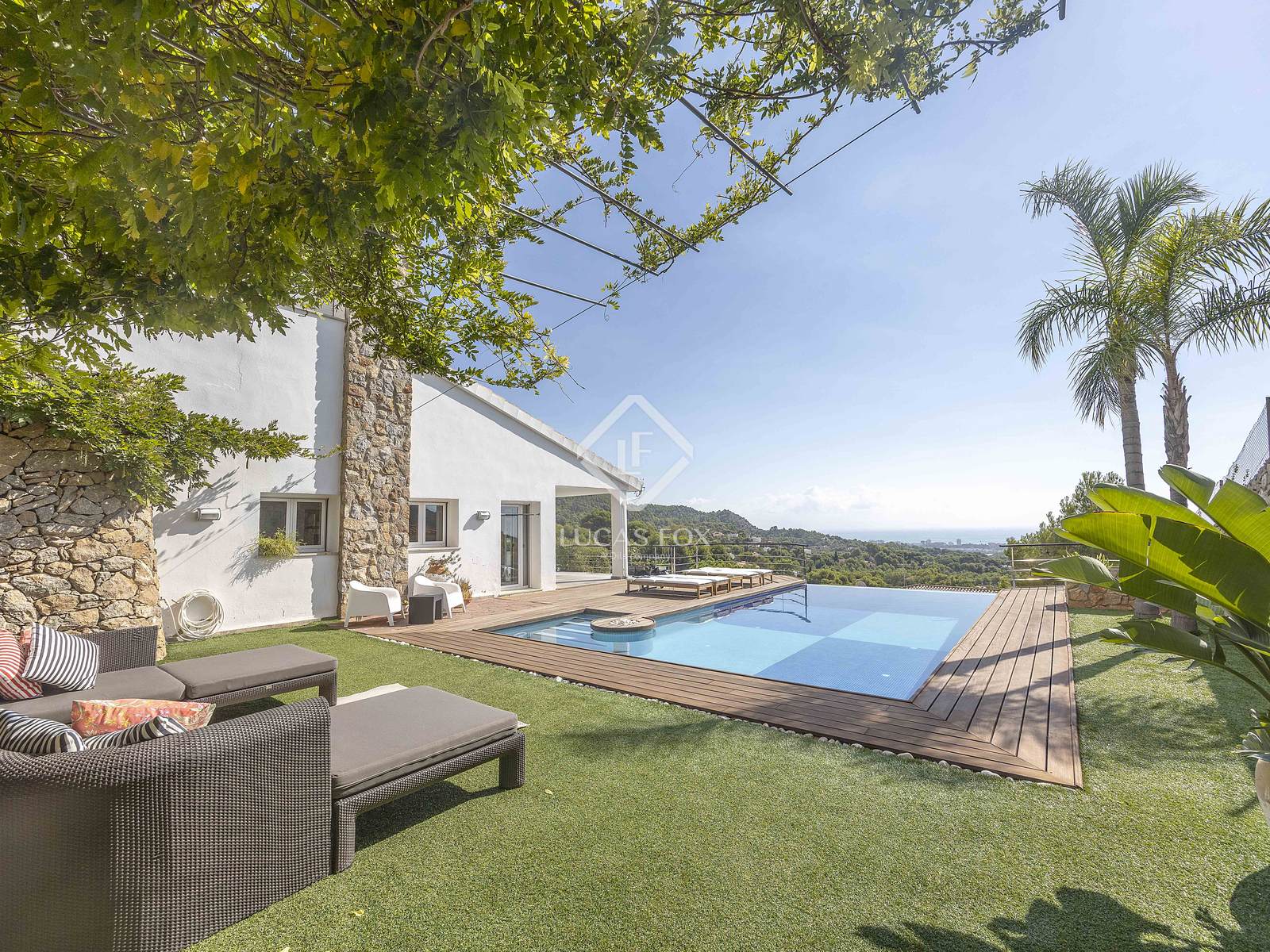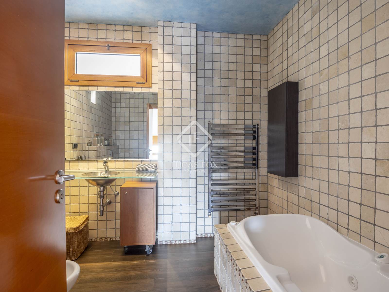 Do lado de fora, o jardim maduro circunda a casa com vegetação nativa. Ele conta com uma magnífica piscina de 10 x 4,5 metros, perfeita para se refrescar nos meses mais quentes. Há também uma cozinha ao ar livre, ideal para reuniões de verão. O espaço é complementado por diversas áreas de relaxamento, incluindo terraços cobertos e abertos.