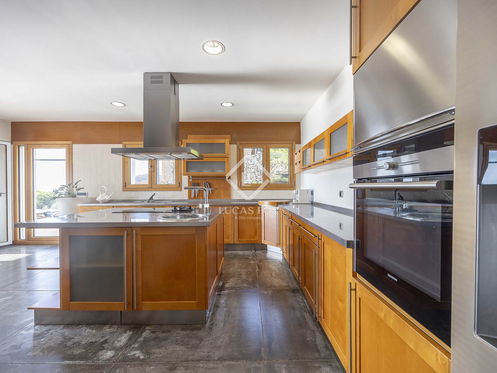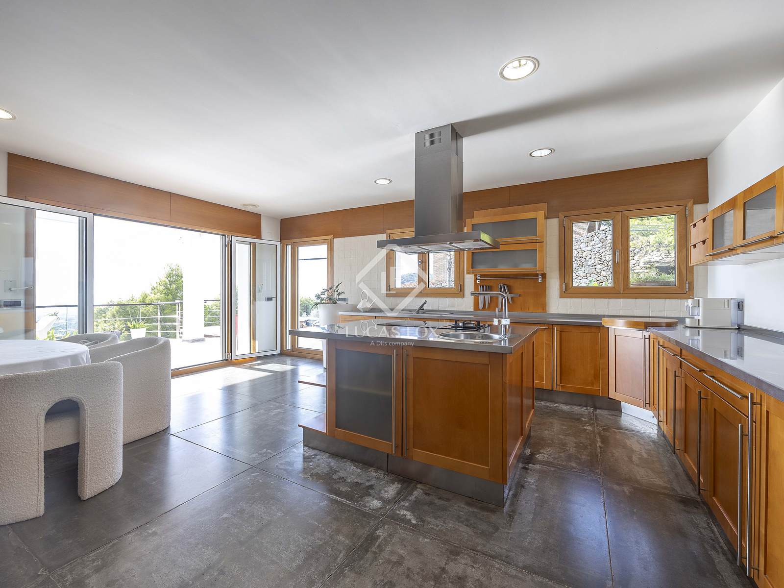 A entrada principal se abre para uma sala de estar e jantar espaçosa e iluminada, com lareira e grandes janelas com vista para os arredores. Elas se abrem para a área externa, especificamente para um dos terraços principais, ideal para refeições ao ar livre. Dali, você pode desfrutar da vista para o mar. A cozinha espaçosa e funcional está organizada em torno de uma grande ilha central. É totalmente equipada, possui uma despensa prática e tem acesso direto à sala de estar, ideal para o uso diário. Há também uma lavanderia.