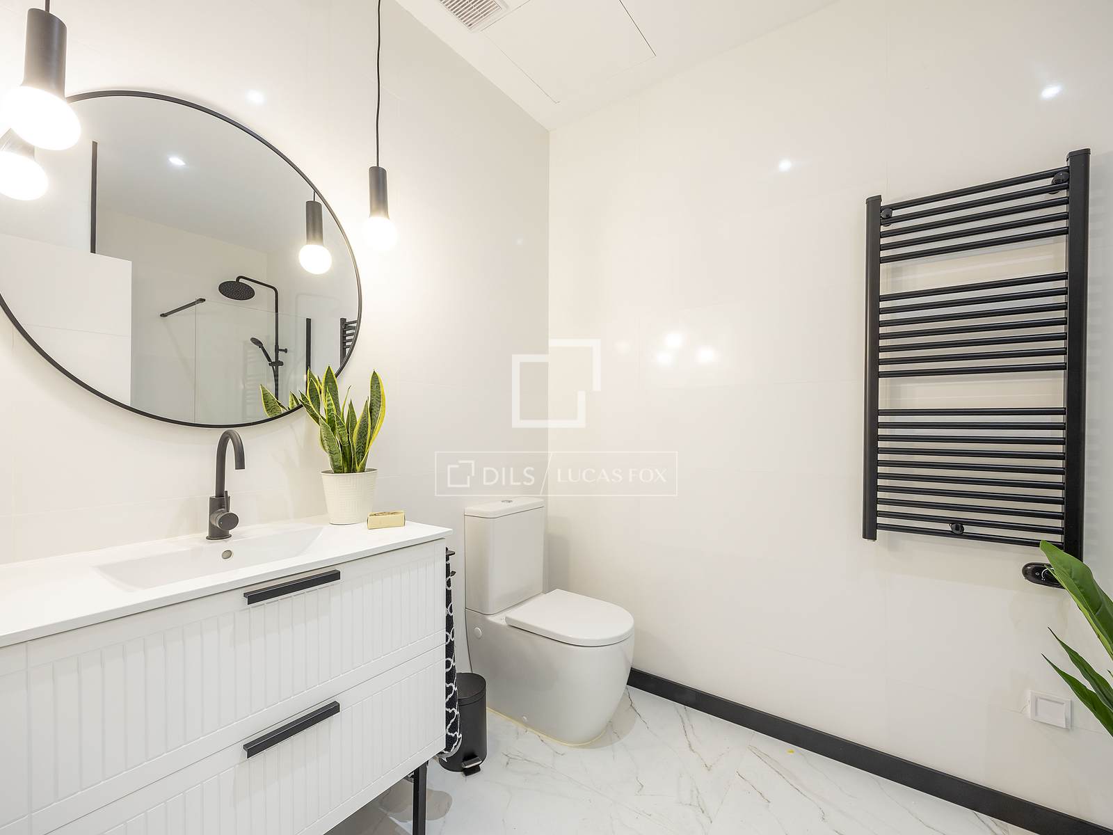 A casa de banho apresenta um design moderno com um chuveiro de acesso direto e um radiador de toalhas elétrico, elementos que proporcionam funcionalidade e conforto.