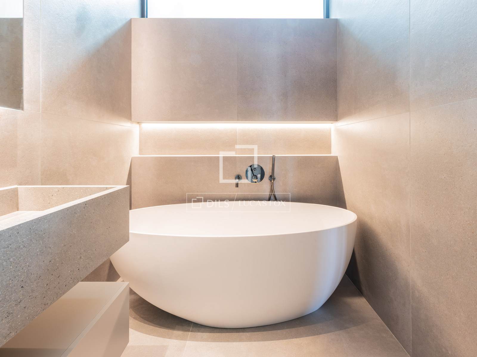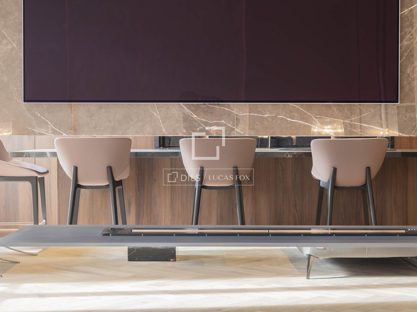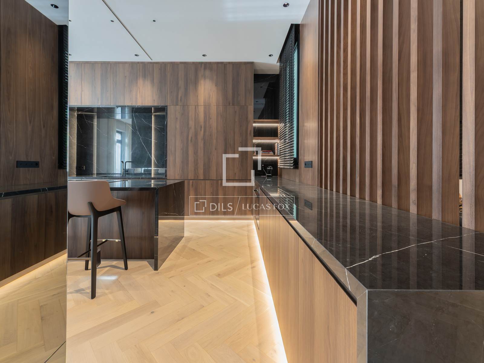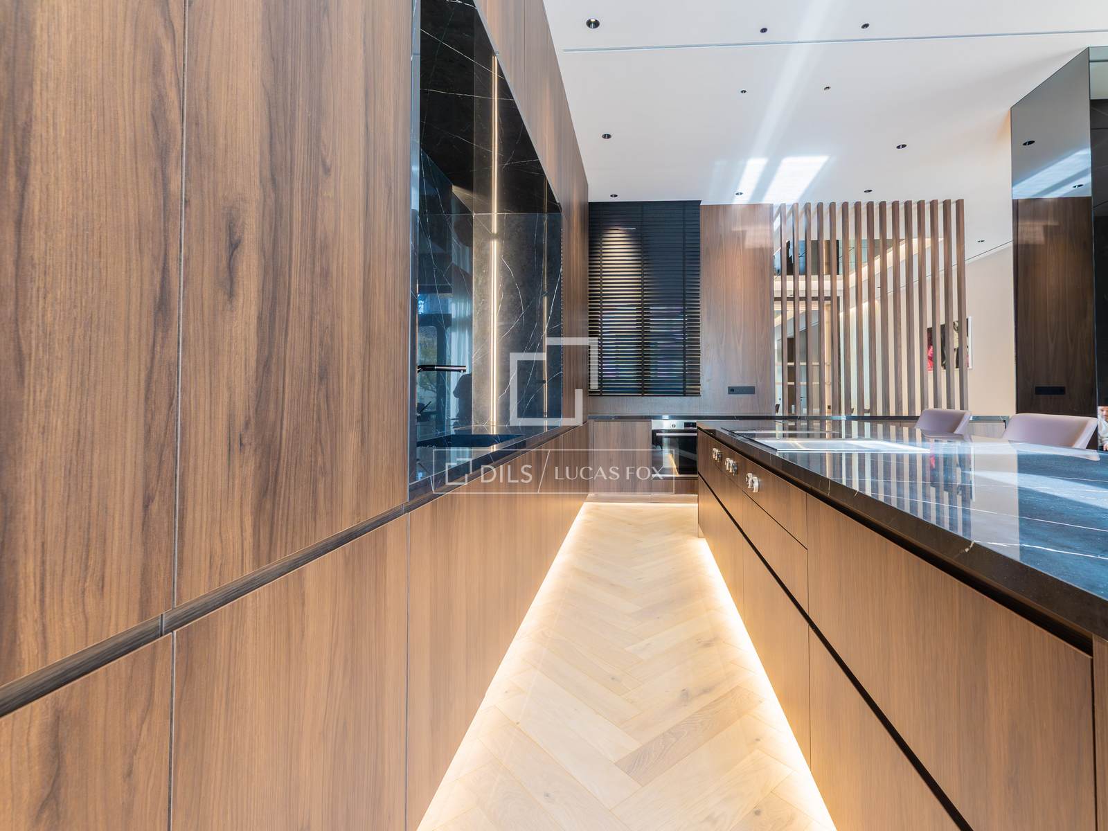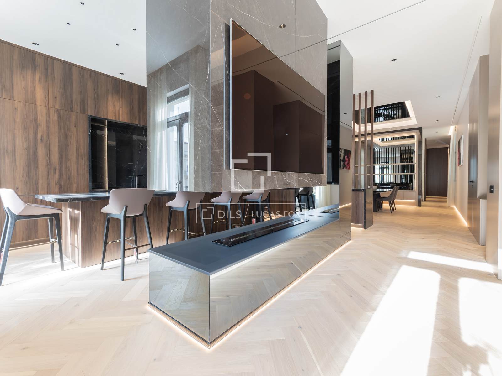 Ao lado da sala de estar fica a cozinha, separada por uma elegante estrutura de pedra natural e uma acolhedora lareira, que confere personalidade e aconchego ao ambiente. A cozinha apresenta uma ilha central espetacular com espaço para banquetas e uma área de refeições informal, eletrodomésticos embutidos de alta qualidade, acabamentos da Porcelanosa e mobiliário em tons neutros. A sala de jantar, integrada à cozinha, cria um espaço fluido e altamente funcional. Um lavabo também está localizado neste andar.