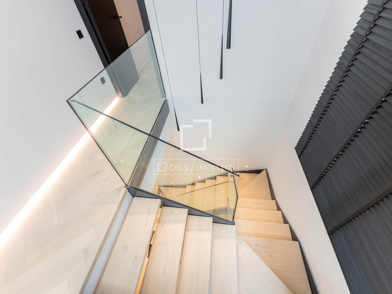 Uma escadaria confortável e elegante conduz ao andar superior, onde um quarto de casal apresenta tetos inclinados e vigas de madeira originais restauradas, pintadas de preto, complementadas por uma sofisticada disposição de espelhos fumê. Este quarto possui banheiro privativo. Também localizado neste andar encontra-se outro quarto com banheiro e uma prática área de lavanderia.