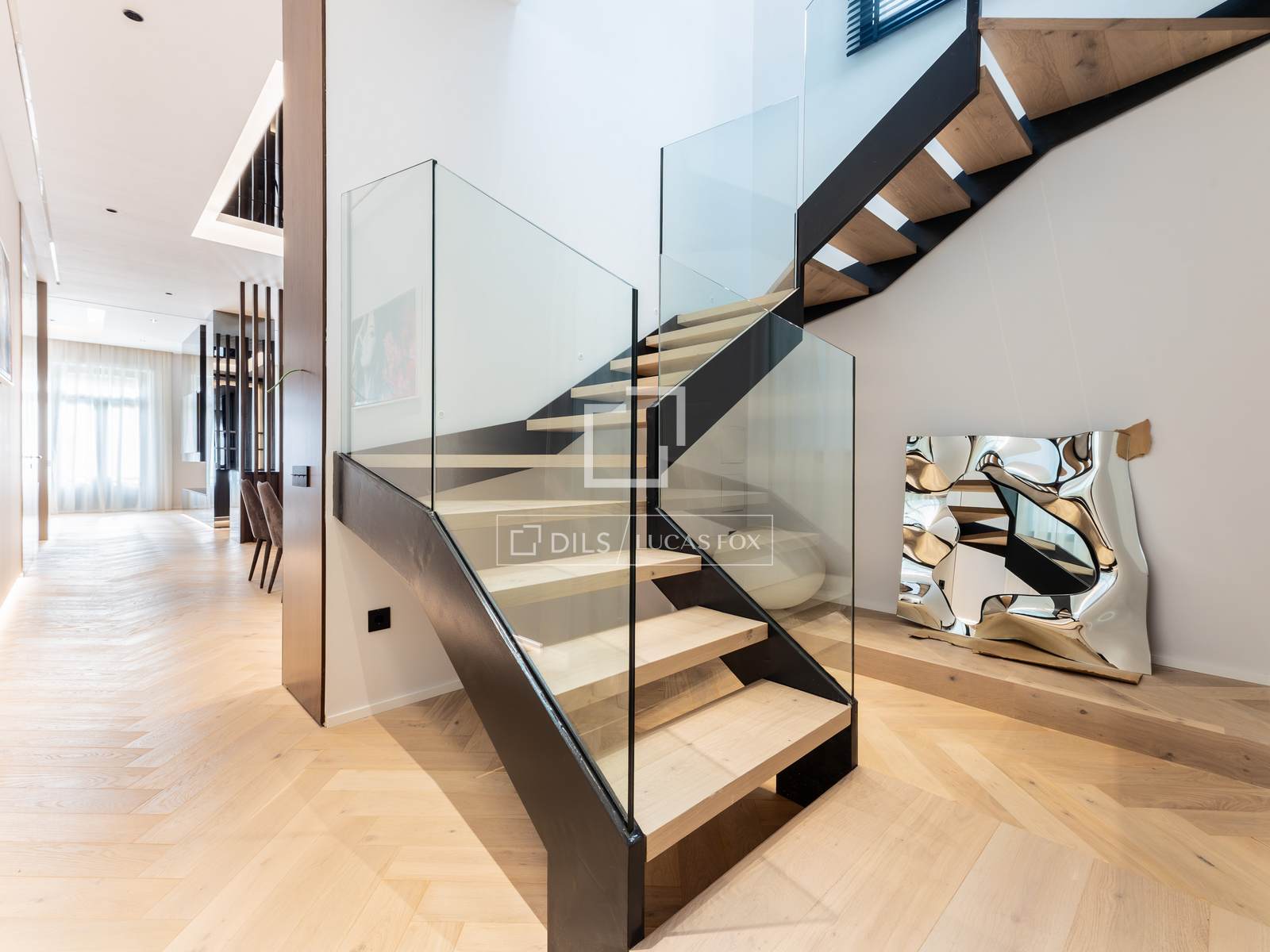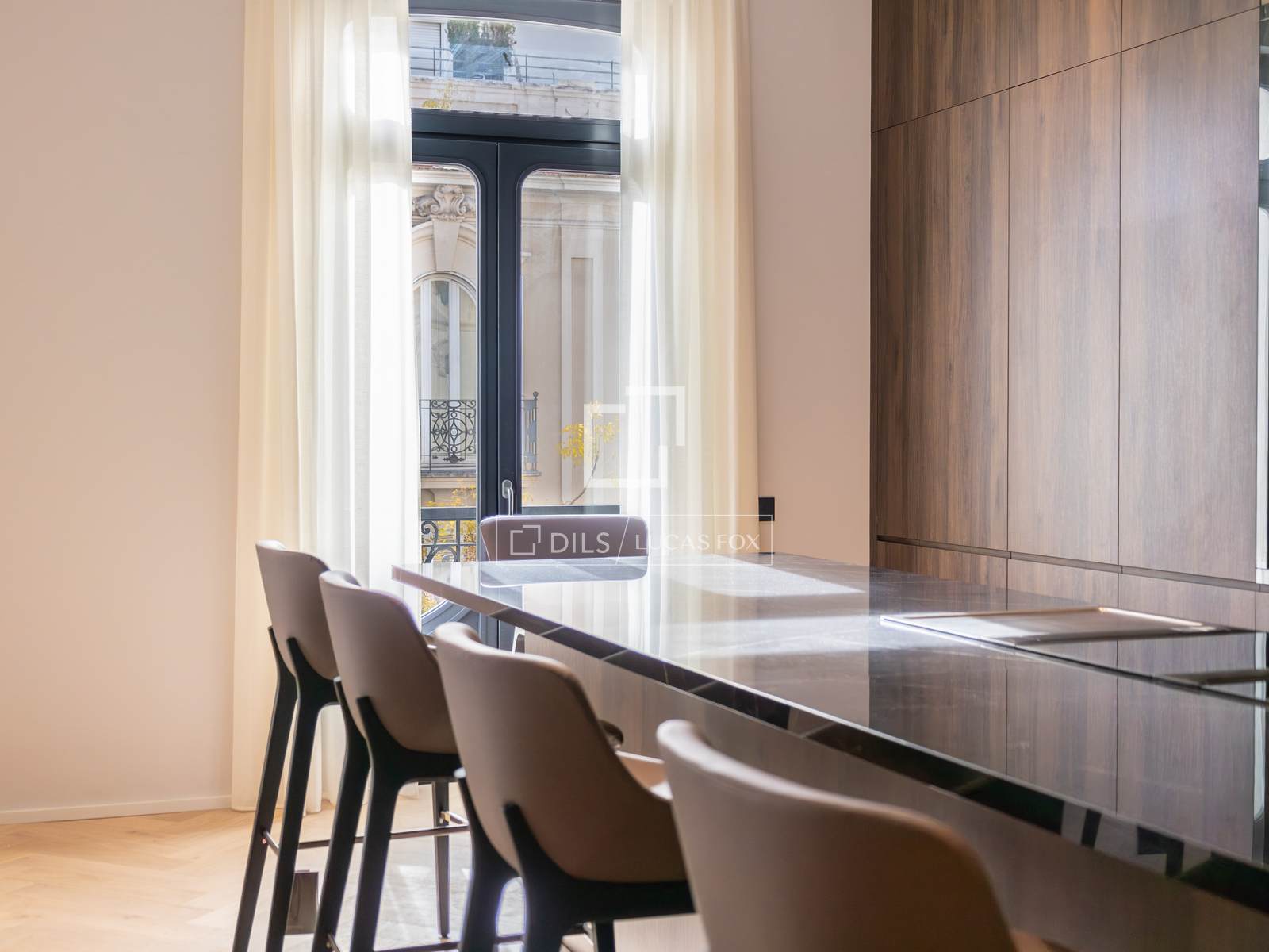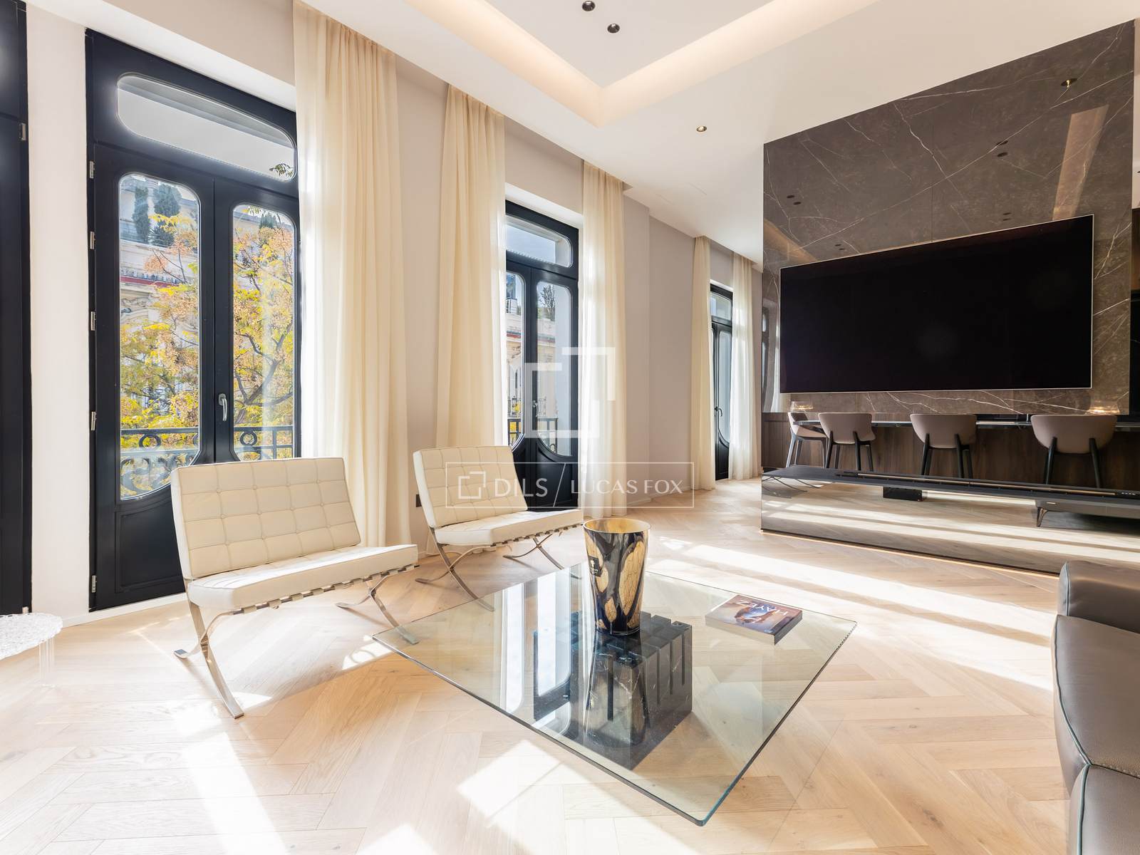 A entrada na propriedade se dá por uma impressionante sala de estar/jantar, um espaço excepcionalmente amplo dividido em zonas distintas, com pé-direito superior a 3,60 metros que cria uma extraordinária sensação de amplitude e luminosidade. Três grandes janelas se abrem para a rua a partir da sala de estar, uma das quais dá acesso a uma agradável e espaçosa varanda com vista desimpedida para edifícios históricos e áreas arborizadas. A propriedade recebe abundante luz natural e o agradável sol da manhã.